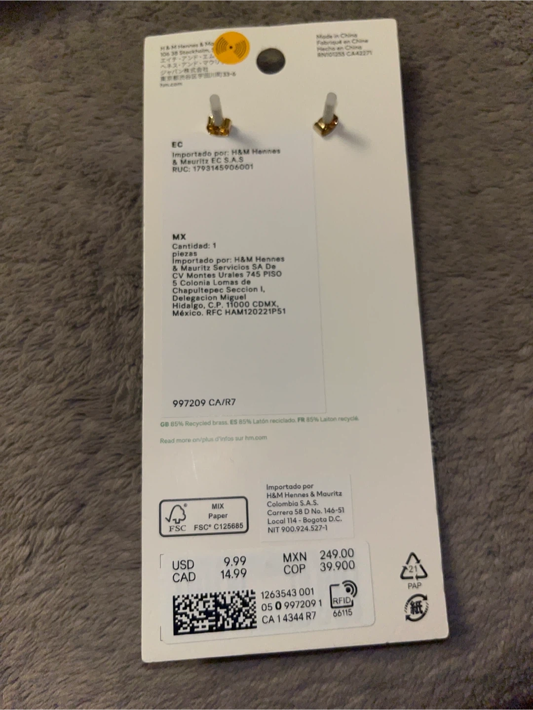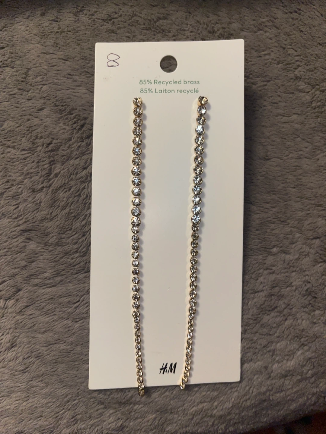 These H&M dangle earrings are brand new and still on the original card! They feature 85% recycled brass and 85% laiton recycle. The original price was $14.99 CAD
