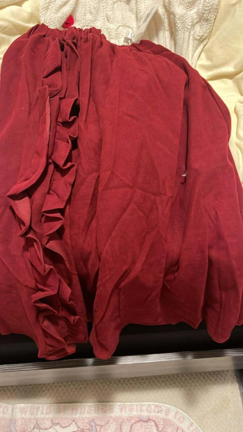 Selling a cute sweater and skirt set! The sweater is white with adorable Christmas-themed embellishments. The skirt is a lovely shade of red with a ruffled detail. Perfect for the holiday season or any festive occasion!