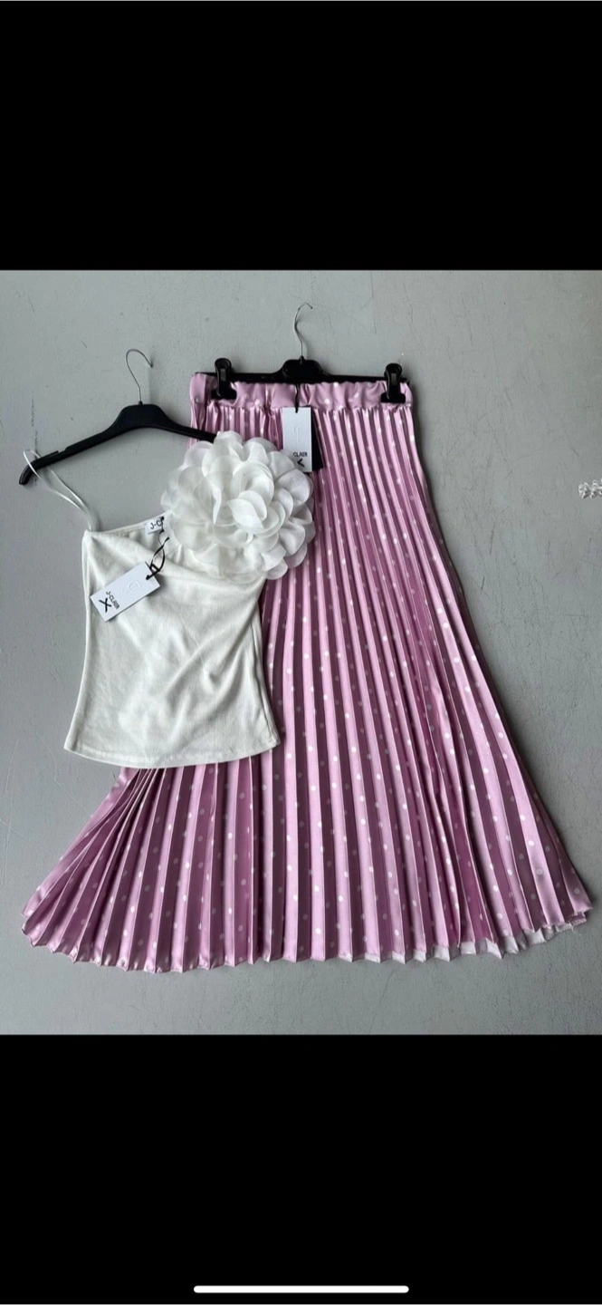 This is a cute J-Clair skirt and top set! The skirt is a lovely pink with white polka dots and a pleated design. The top is a simple white tank style with a decorative flower detail. Perfect for a stylish and coordinated look!