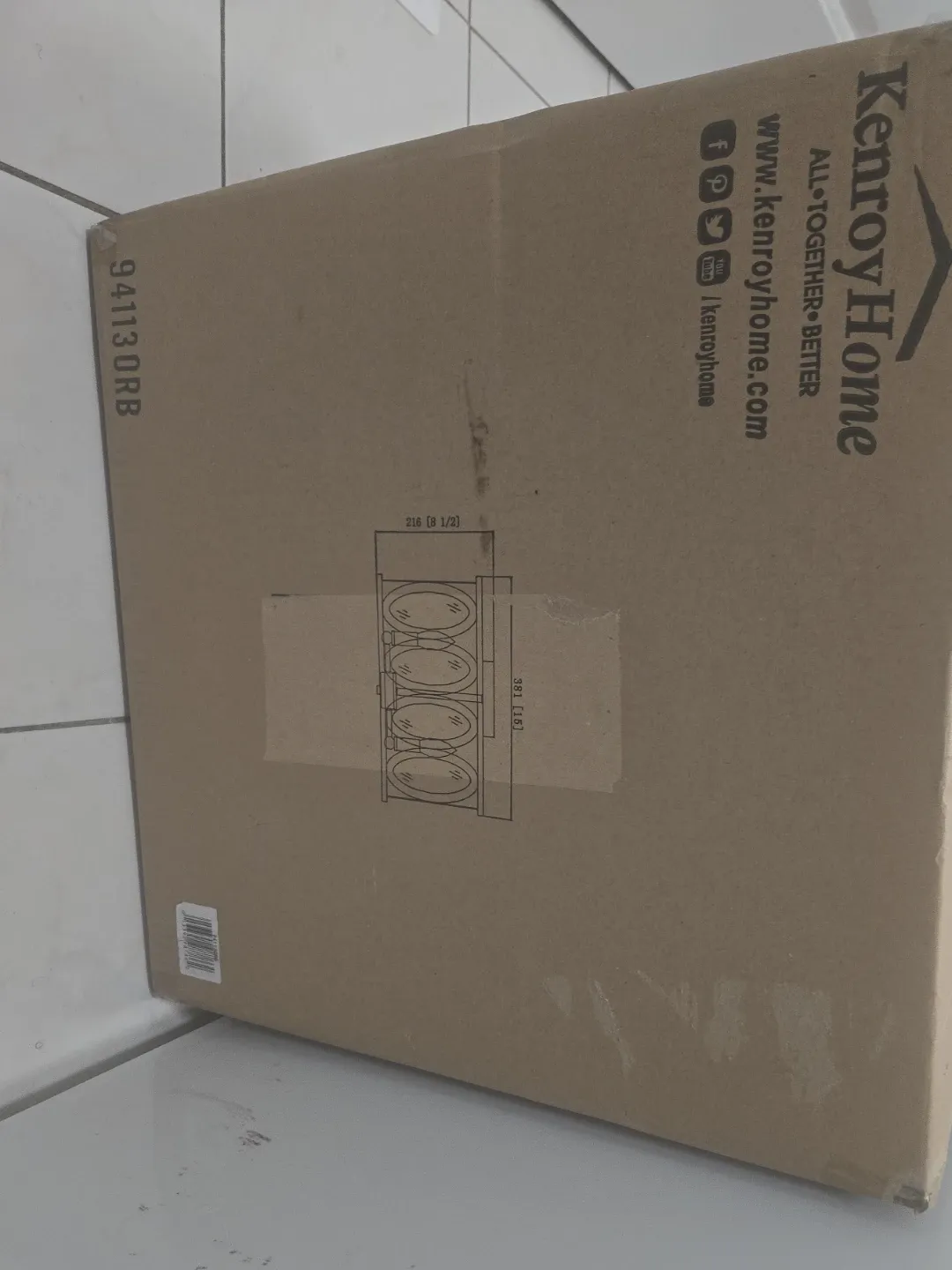 Selling a Kenroy Home item, model number 94113ORB! The box has the website and social media handles printed on it if you want to check out their other products! The dimensions are also visible on the box, 216 [8 1/2] and 381 [15]