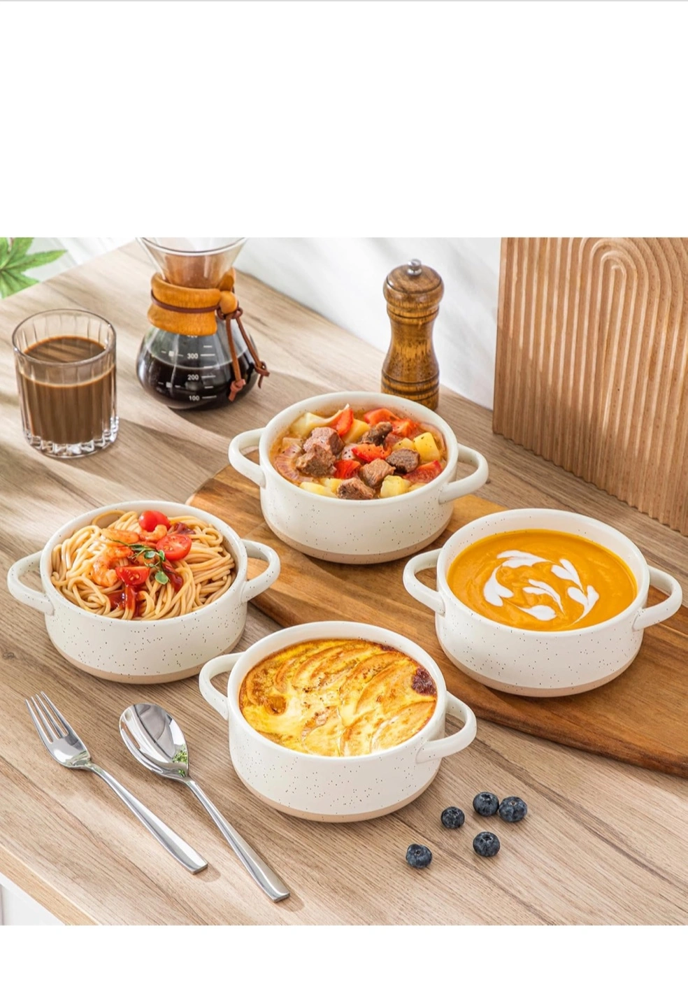 Selling a set of four vancasso Sabine soup bowls! These are perfect for serving up your favourite soups, stews, or even pasta dishes. They're oven-safe and have convenient handles for easy carrying. The bowls are beige and hold 30 oz each. Comes with the original box!