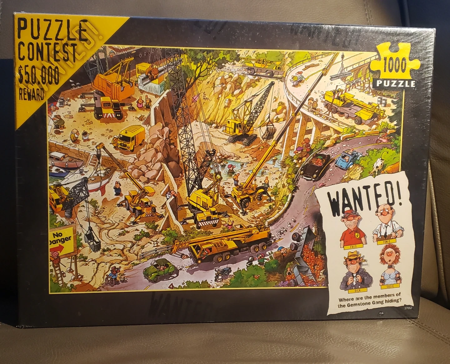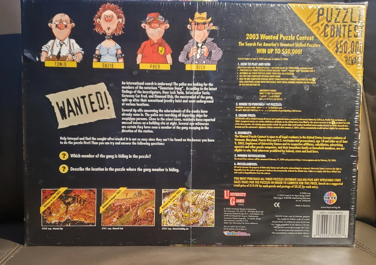Selling a new University Games 1000-piece puzzle titled "Wanted Puzzle Contest". It's a fun challenge to find the Gemstone Gang hiding in the picture! The box includes details on the 2003 Wanted Puzzle Contest, offering a $50,000 reward. Released in 2003.