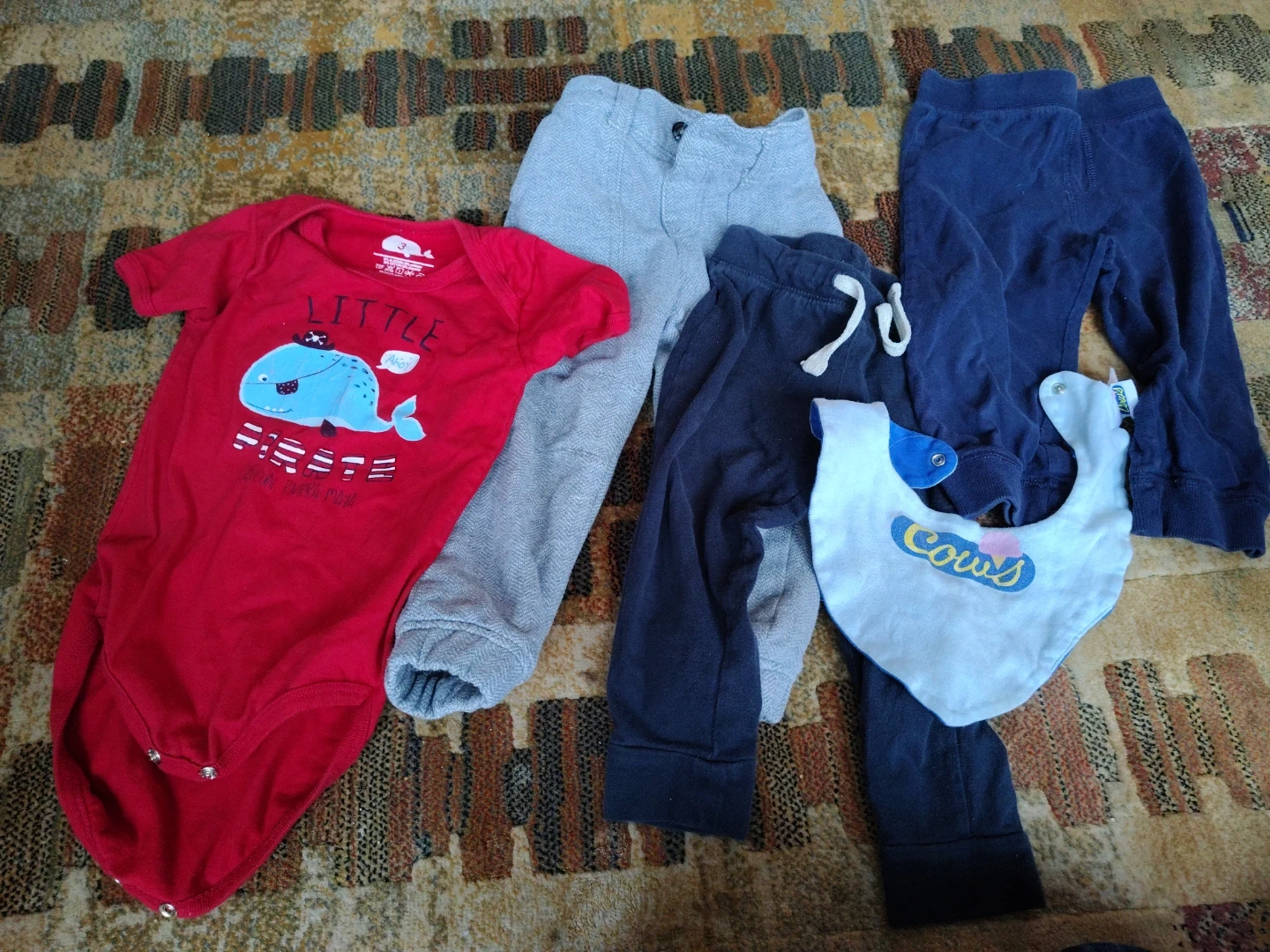 Selling a cute bundle of 18-24 mths clothes! Includes a red bodysuit with a whale design, a pair of warm grey dress pants, two pairs of navy blue pants, and a bib with a cow design.