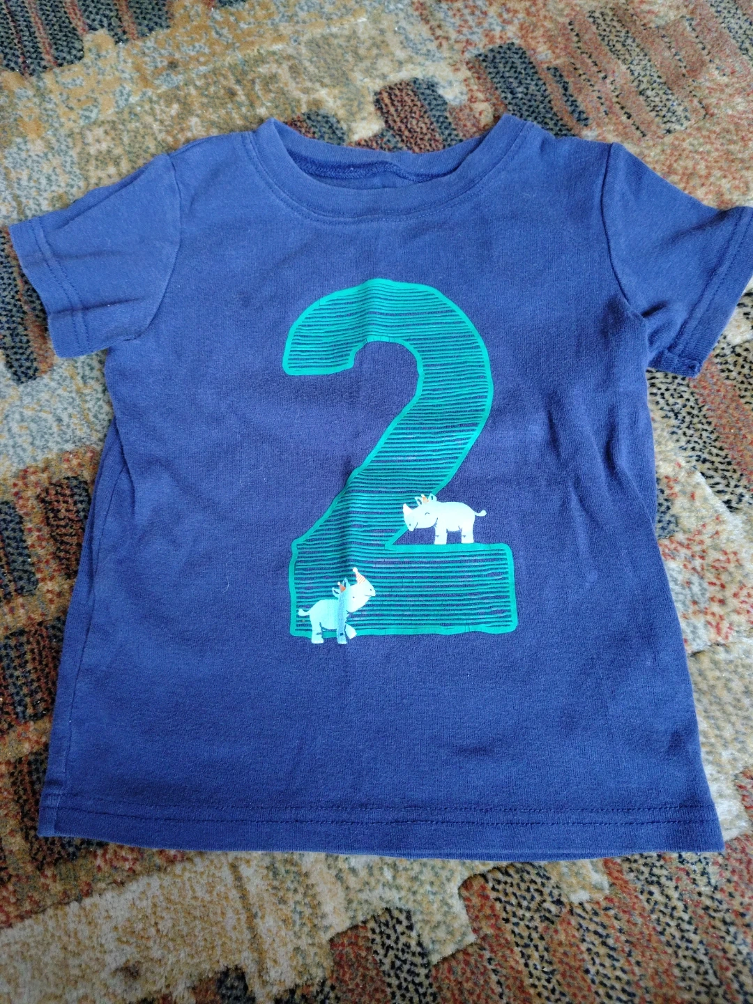 This is a cute blue t-shirt for kids, size 2. It features a big number '2' design with little rhinos on it. Perfect for a birthday π