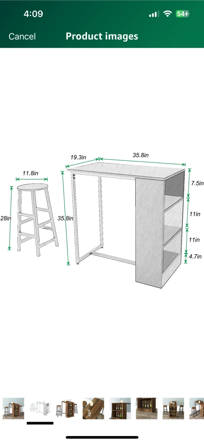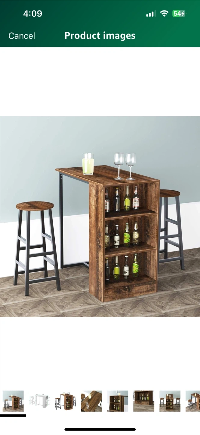 Selling a rustic brown bar table with two stools. The table features a built-in shelf for storing drinks or other items. The dimensions of the table are approximately 35.8 inches in length, 19.3 inches in width, and 35.8 inches in height. The stools are about 28 inches high with a diameter of 11.8 inches.