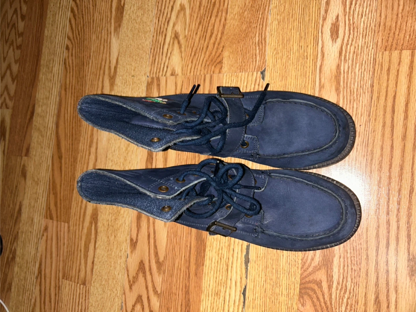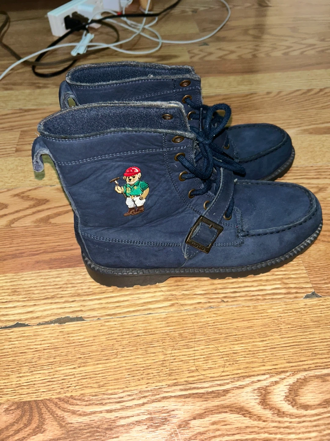 Selling a pair of Polo Ralph Lauren Ranger Hi II boots in a size 5.5. They are blue and made with a leather upper and rubber sole. They are in used condition with some wear, as shown in the pictures.