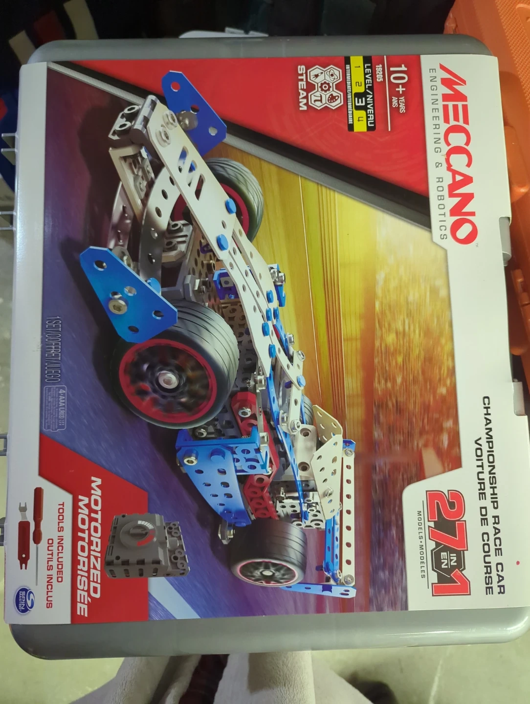 Selling a brand new Meccano Engineering & Robotics Championship Race Car 27 in 1 set! It's suitable for ages 10 and up. This set is intermediate level and includes tools, so it's motorized and ready to build. Fastest pickup