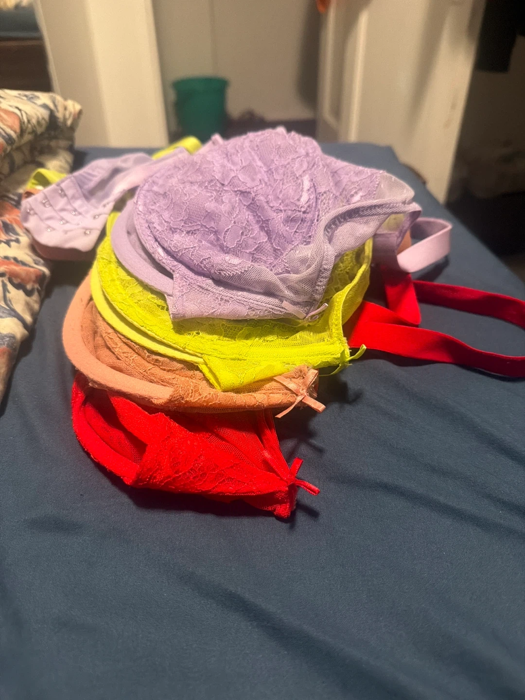 Selling a set of assorted bras in red, lime green, and purple and pink colors. Great condition