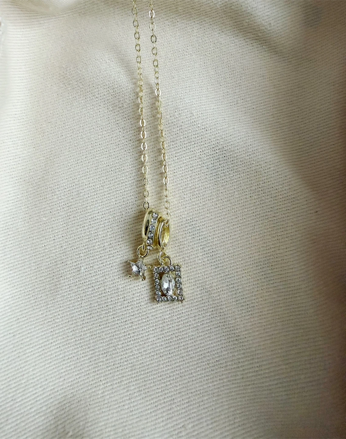 This is a gold-tone necklace with a pendant. It features a square pendant and a star charm. It's in great condition!