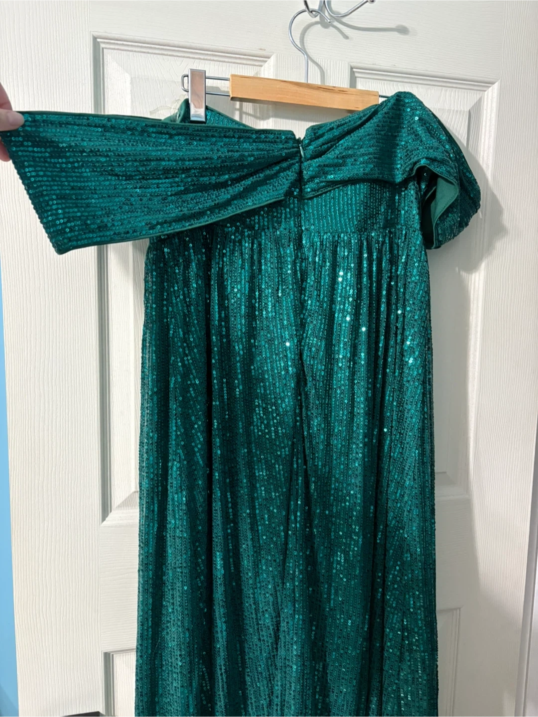 Selling a beautiful emerald green sequin maxi dress. It's perfect for a special occasion. The dress is in great condition and has a lovely shimmer.