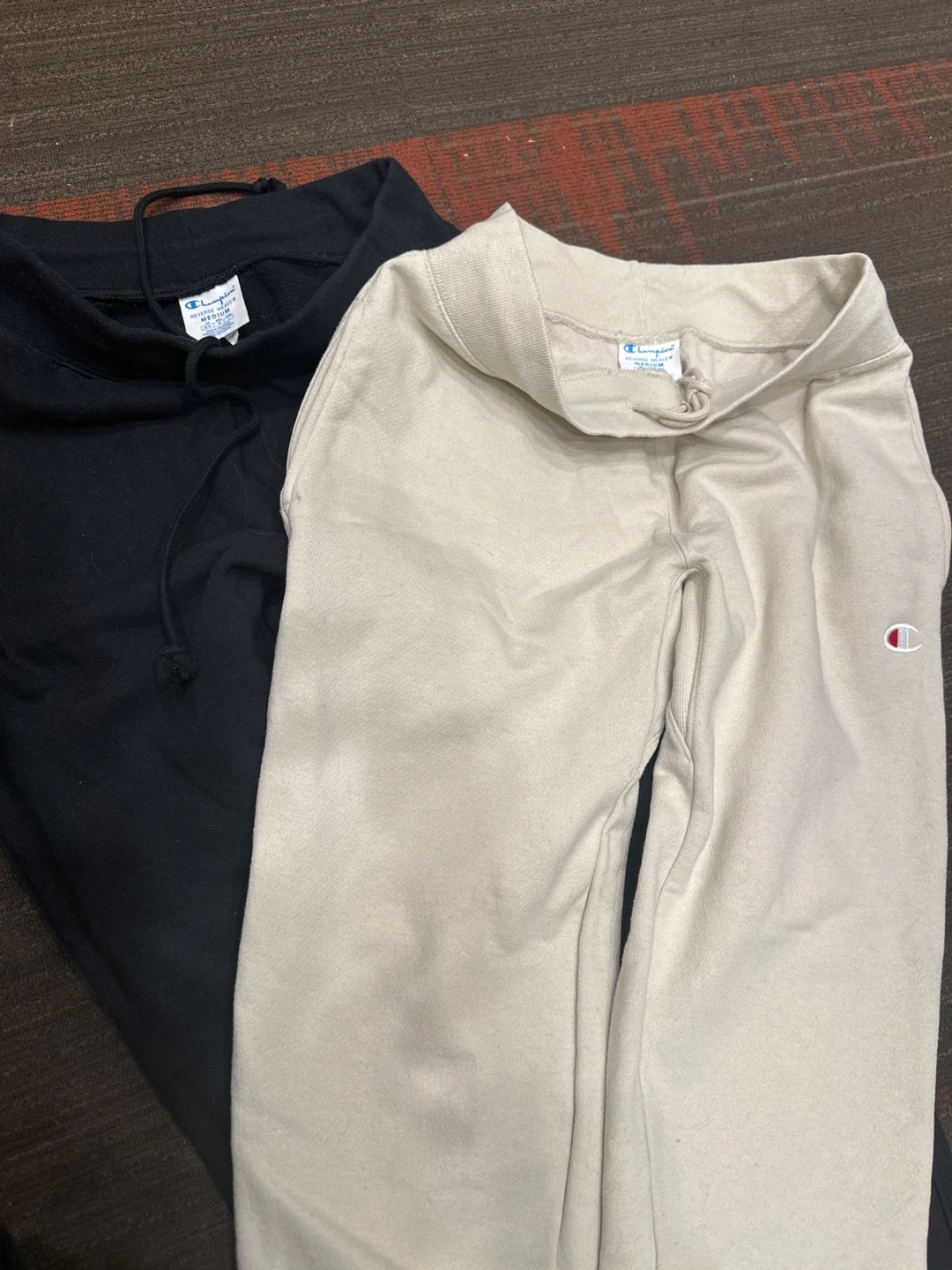 Two pairs of Champion sweatpants up for grabs! One pair is black, and the other is a light beige colour. Both are size medium and in great condition. Perfect for lounging or hitting the gym!