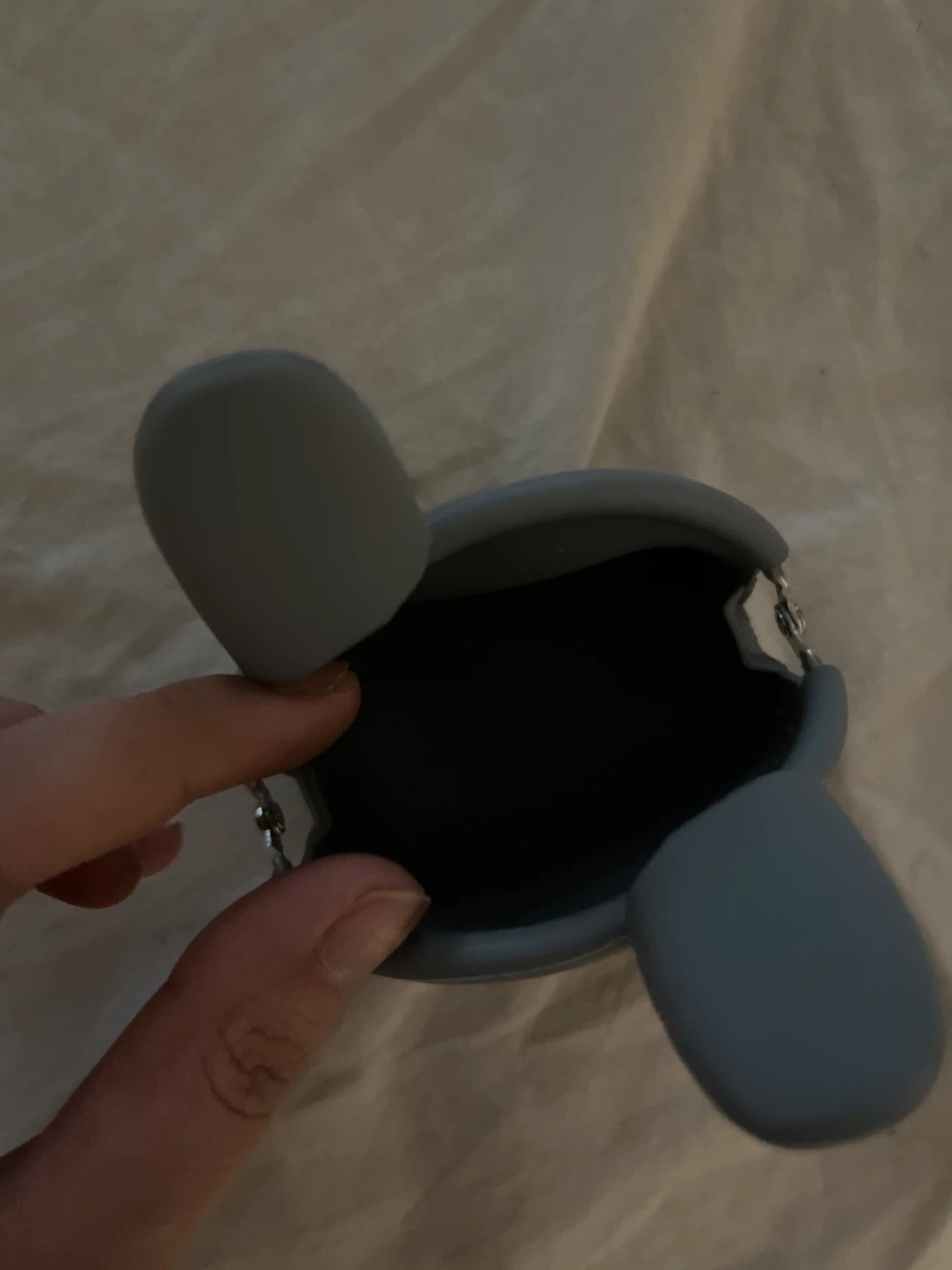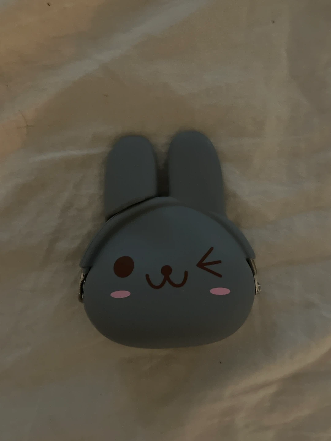 This is a super cute grey bunny coin purse! It's in great condition and perfect for holding your change or small trinkets. It has adorable bunny ears and a sweet winking face design. It's a fun and practical accessory!