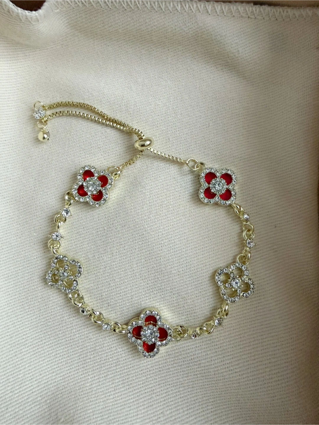 Selling a cute clover flower bracelet! It's gold in colour and has red and clear stones. Would look great with any outfit!