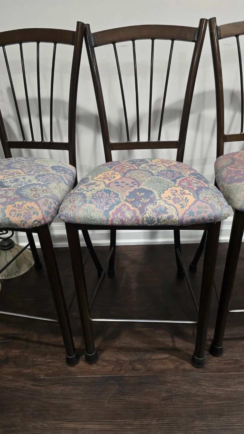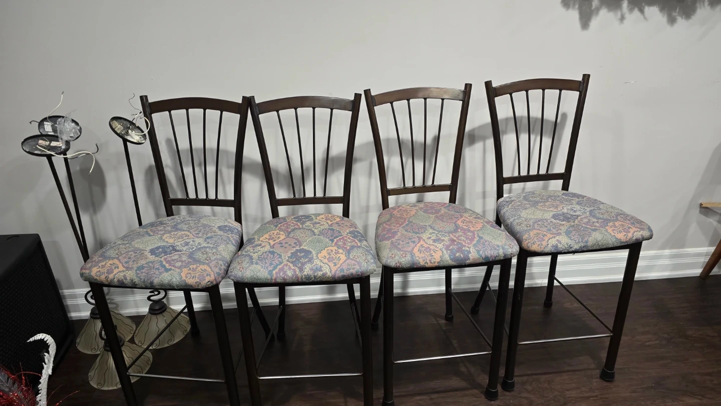 Selling a set of 4 bar stools. They feature cushioned seats with a unique patterned fabric. The frames are a dark brown colour. These stools would be a great addition to any kitchen or bar area!