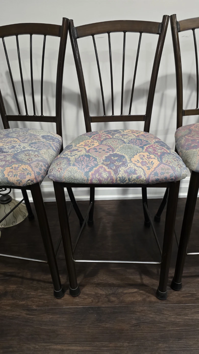 Selling a set of 4 bar stools. They feature cushioned seats with a unique patterned fabric. The frames are a dark brown colour. These stools would be a great addition to any kitchen or bar area!