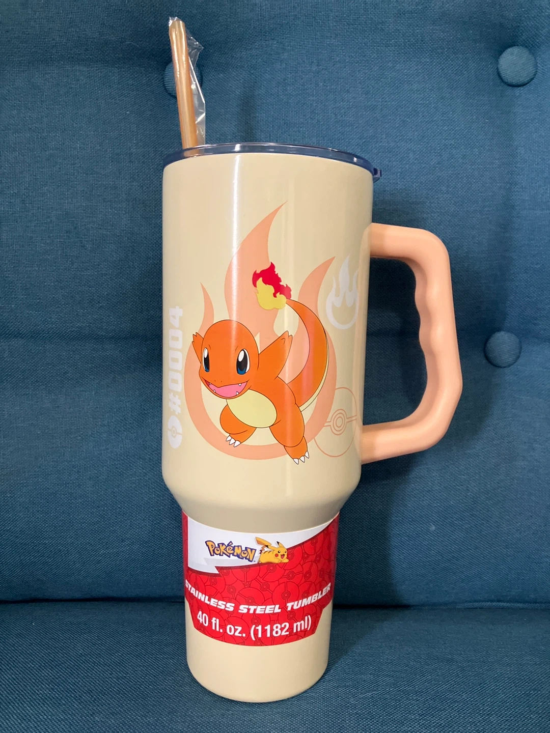 Pokémon stainless steel tumbler featuring Charmander! It holds 40 fl oz (1182 ml),