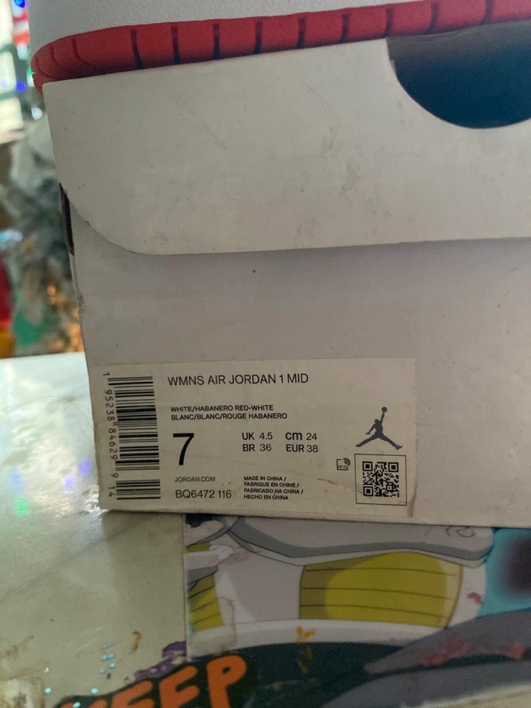 Selling a pair of women's Air Jordan 1 Mid sneakers in a white and habanero red colorway. These are a US size 7, UK size 4.5, EUR size 38, and BR size 36. Comes with the original box!