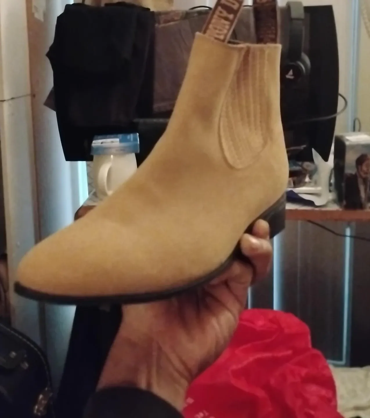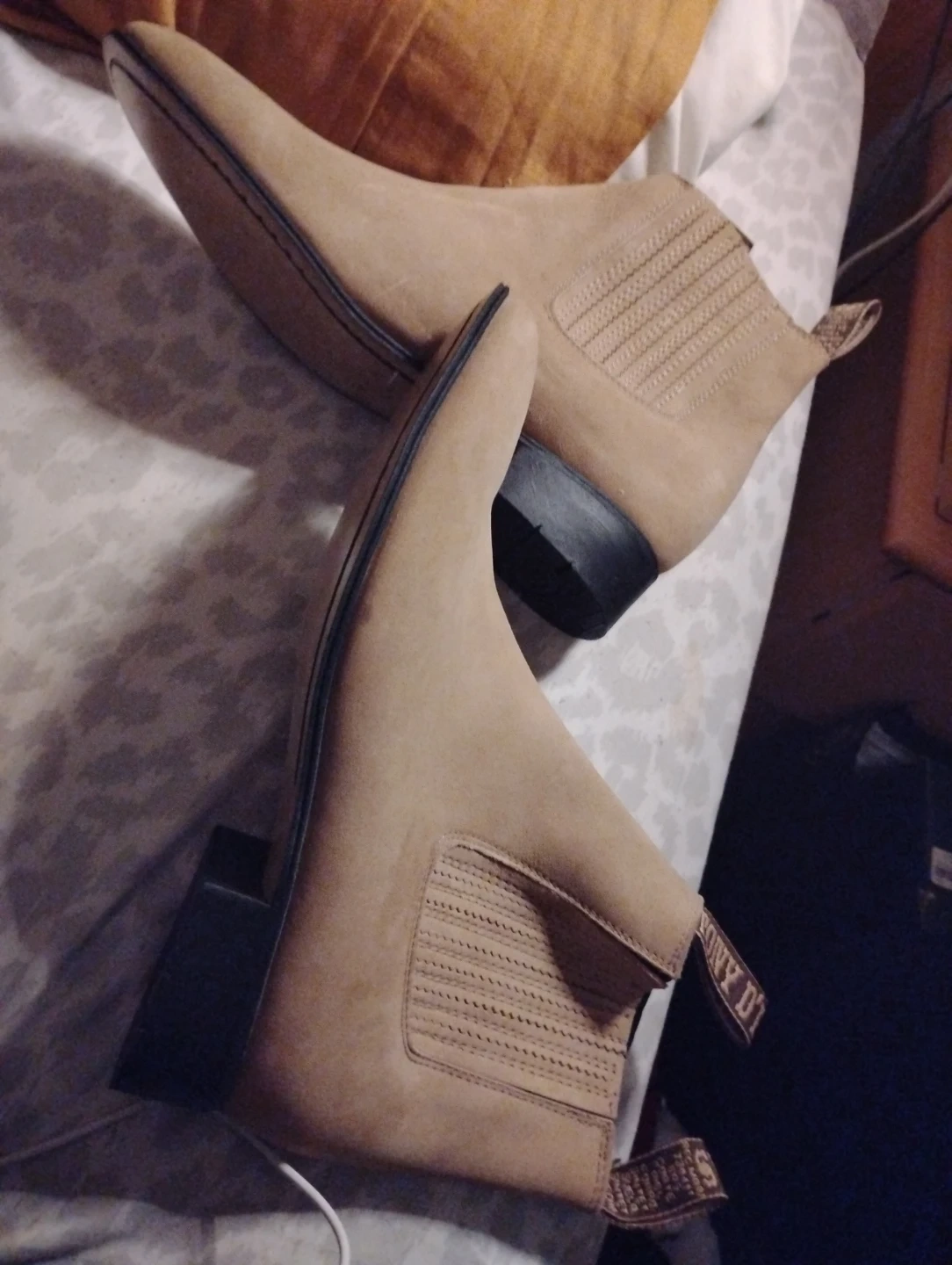 Selling a pair of Tony D' Banderas Chelsea boots in a tan suede. They are a size 7. The boots have a classic Chelsea boot style with elastic side panels and a sleek silhouette. Perfect for adding a touch of style to your outfit!
