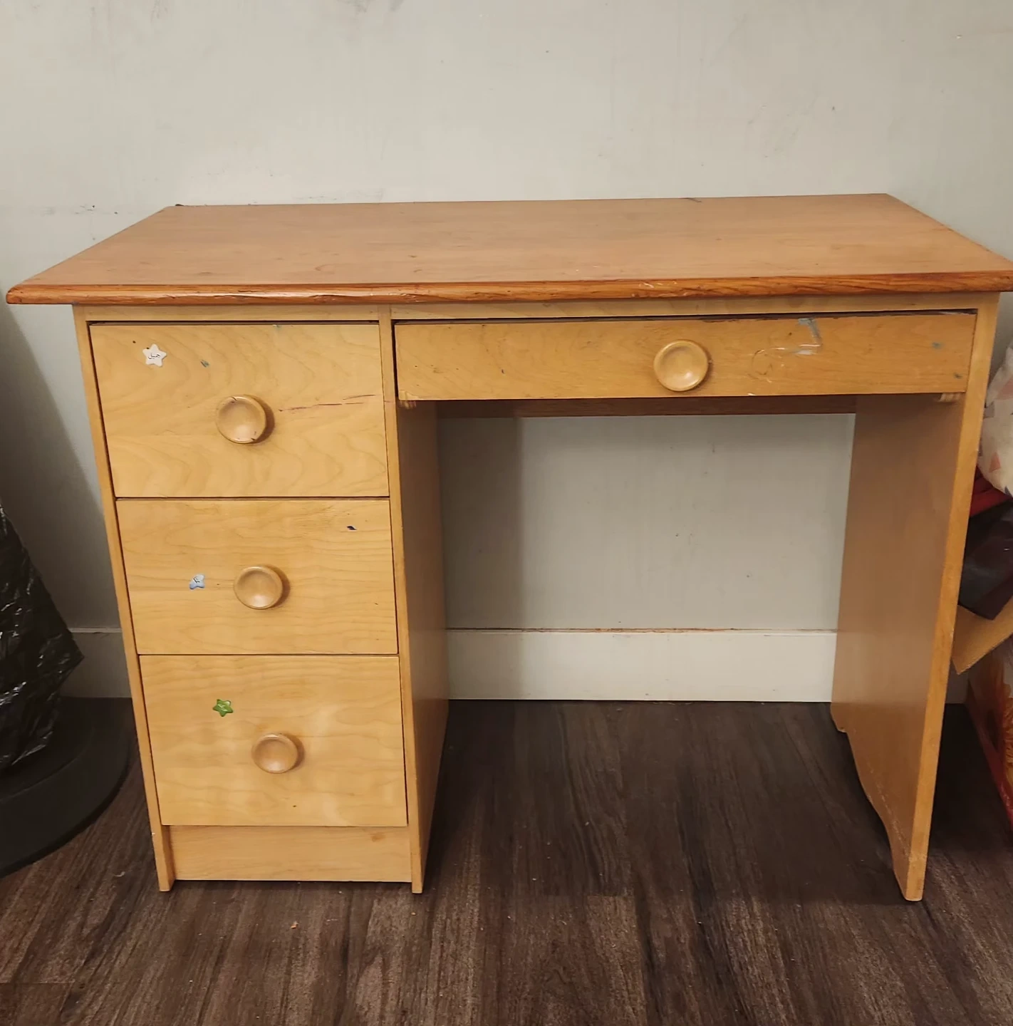 Here's a wooden desk with drawers! It has a natural finish and a classic design. There are some signs of use, like a few small marks, but overall it's in good shape for its age. It would be perfect for a student or anyone needing a compact workspace