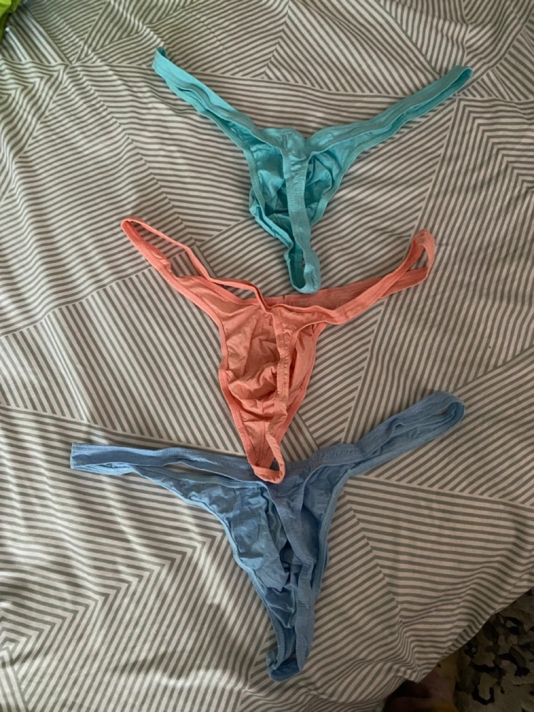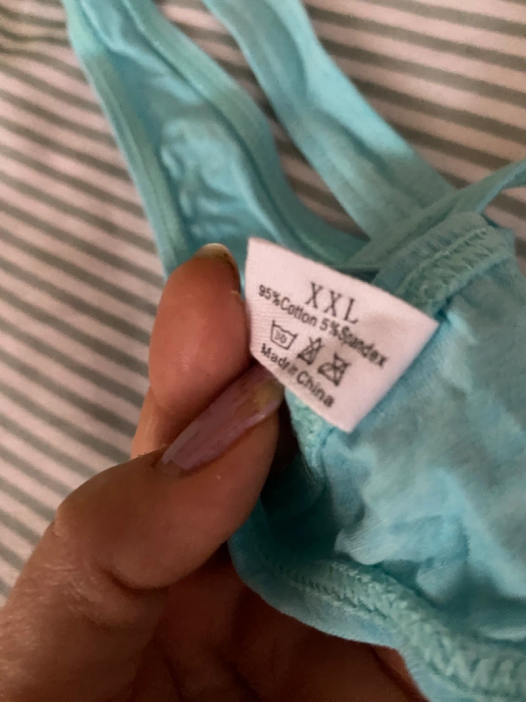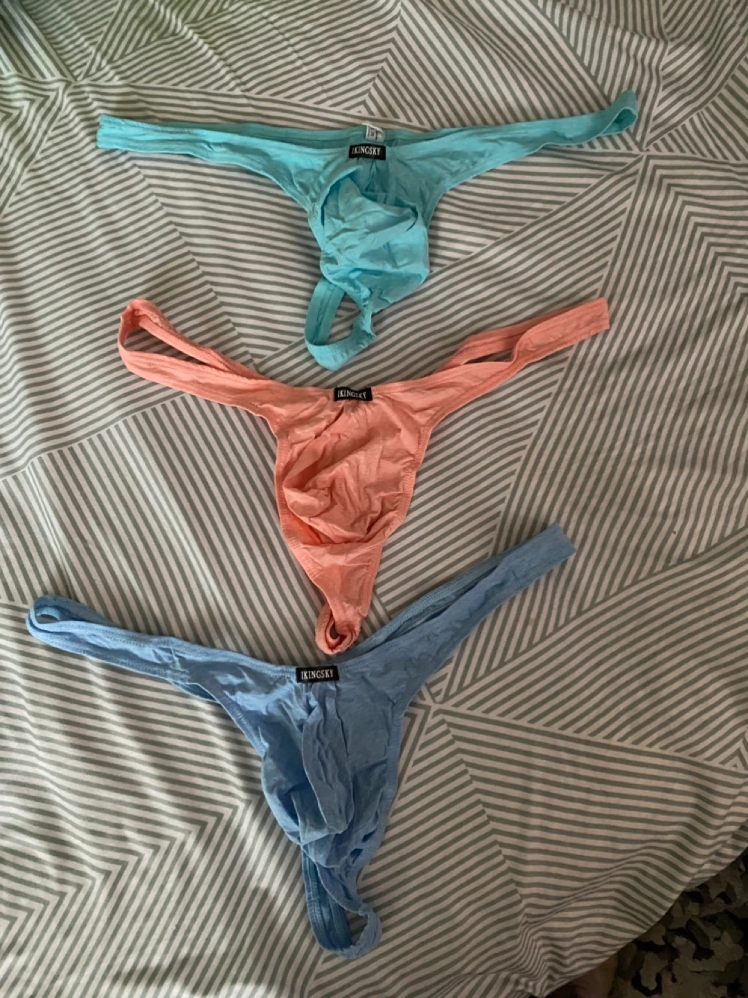 Selling a set of IKINGSKY thong underwear in size XXL. The material is 95% cotton and 5% spandex. There are three pairs in the set, in light blue, peach, and blue colours. They are in good condition