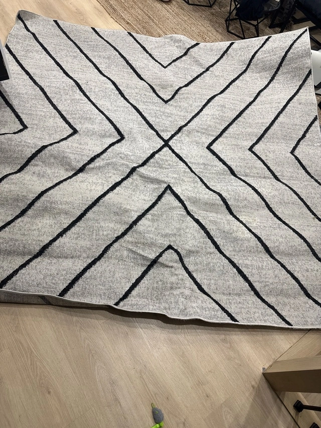 Grey/white/black patterned rug, measuring approximately 8 x 10 feet. This is a used rug, good condition but definitely needs to be washed as it was in the garage. $50 If the ad is still up, the rug is still available!