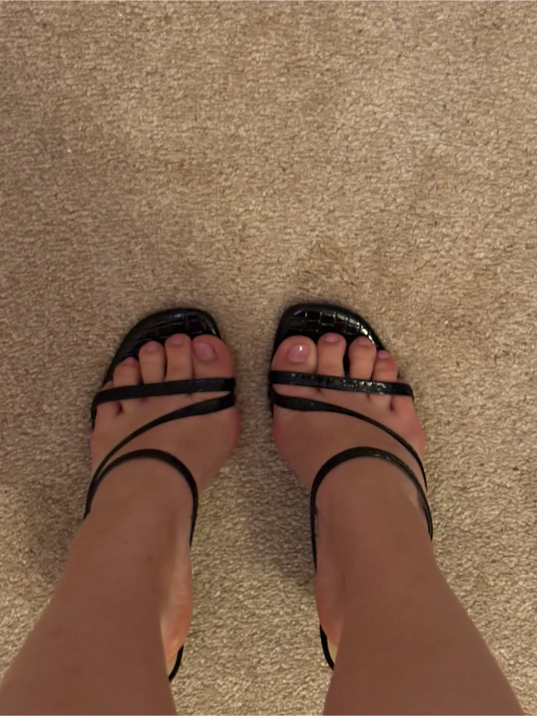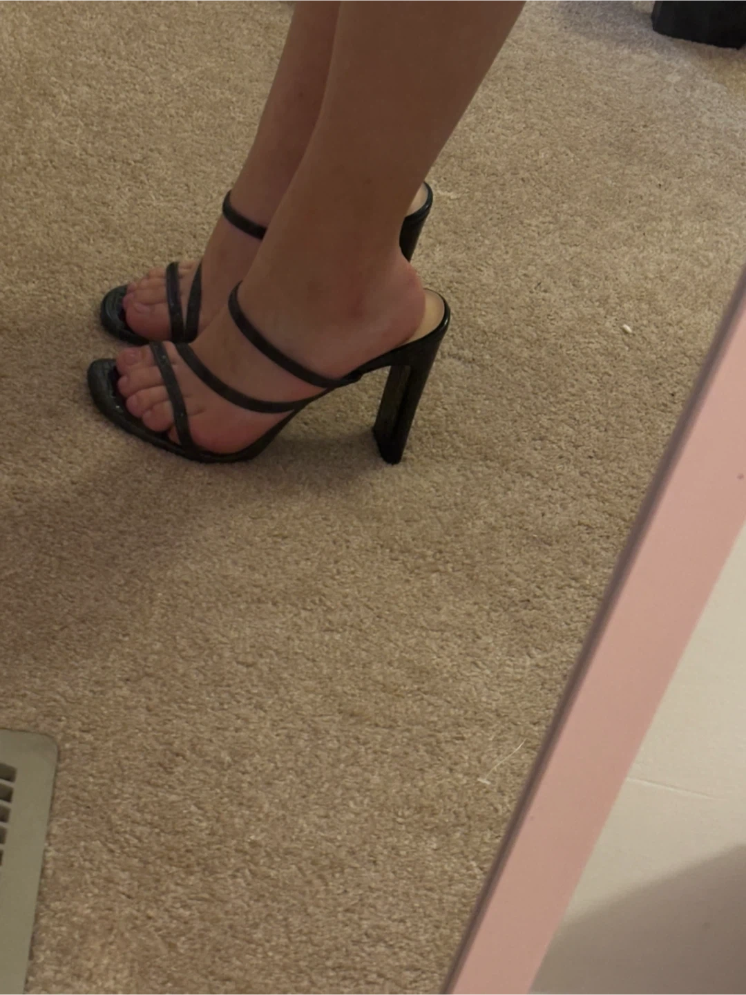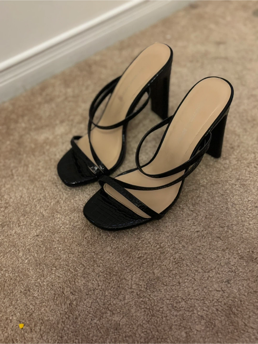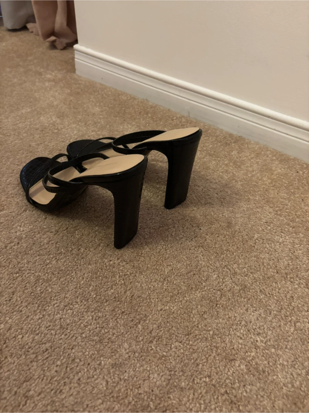 Selling a pair of black heeled mules in size 9. They have a stylish, strappy design. Perfect for dressing up any outfit!