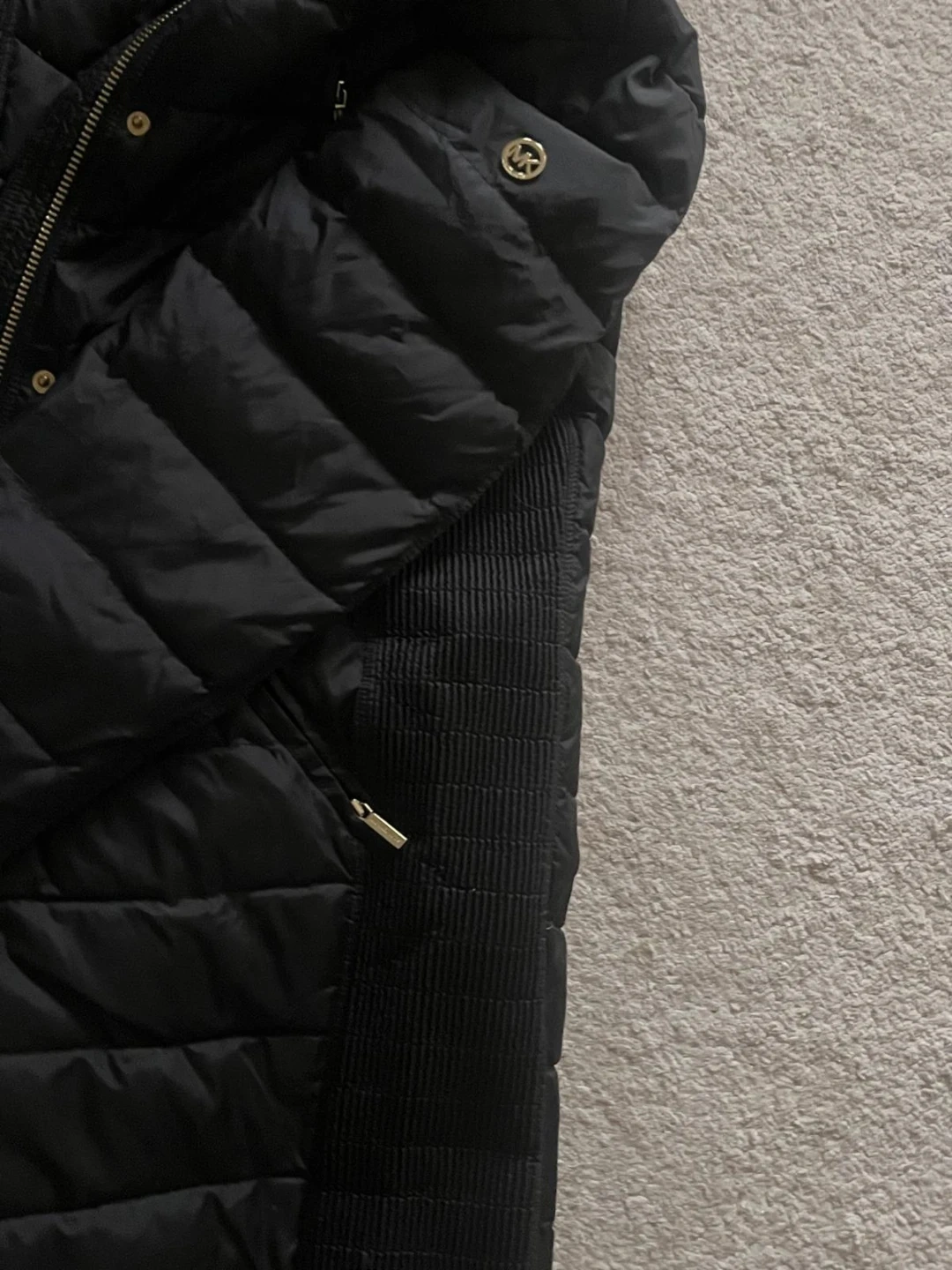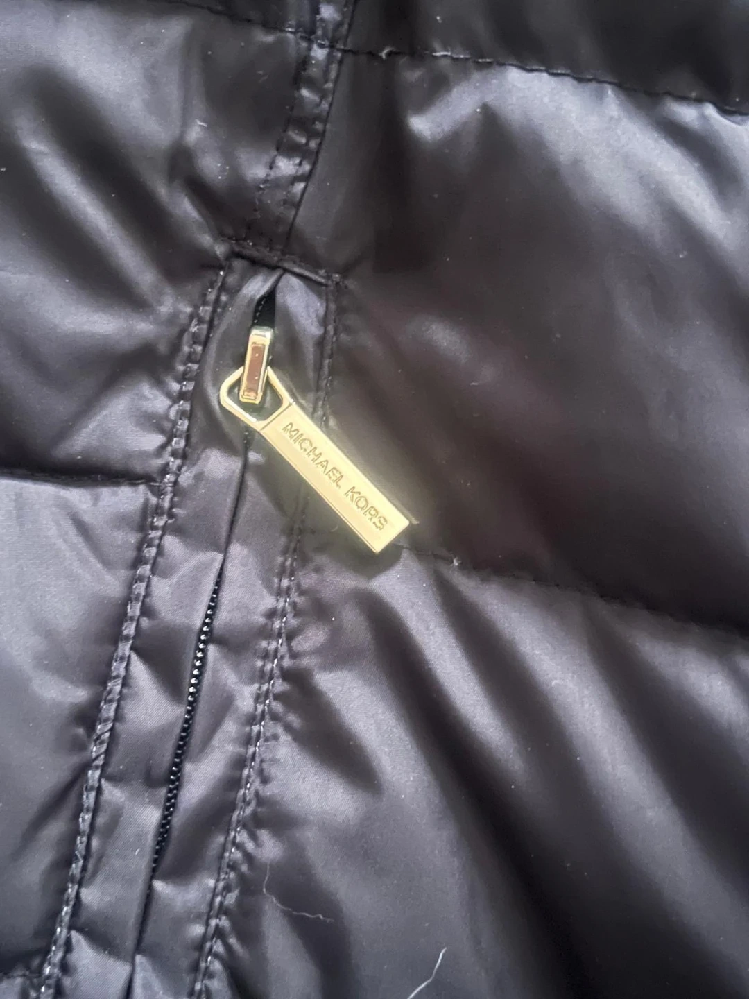 Selling a Michael Kors black puffer coat. It's in great condition and perfect for the colder weather! The coat features a faux fur hood and gold hardware details. It's a stylish and warm choice for the winter season