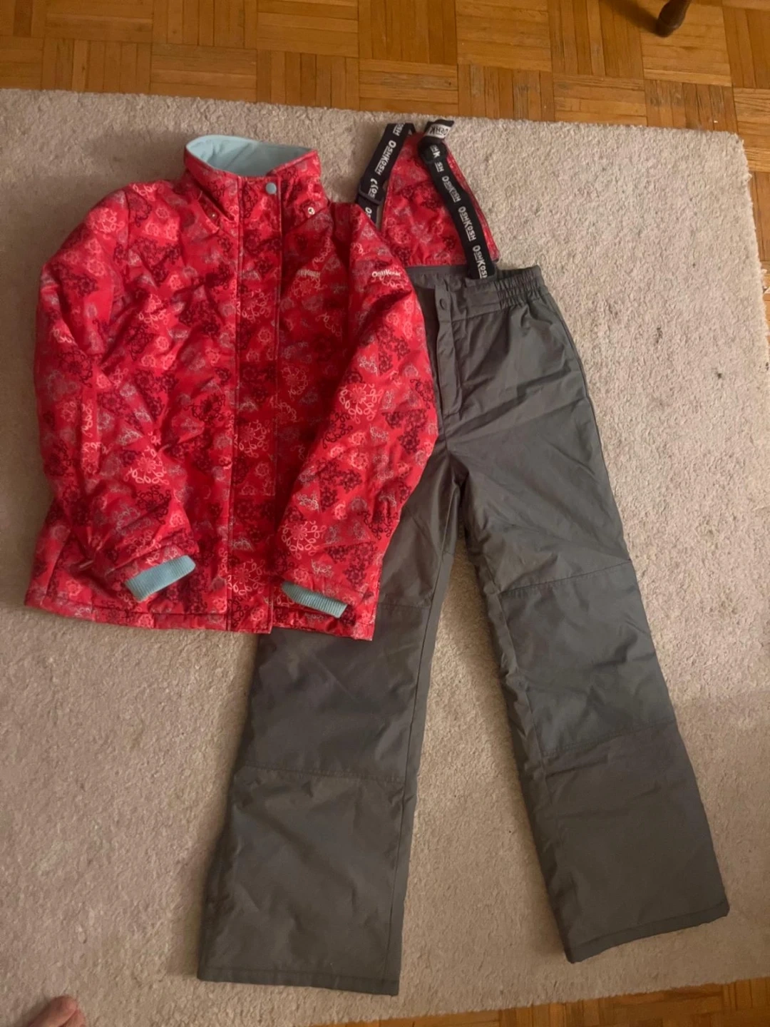 Selling a complete OshKosh B'gosh ski suit! It includes a jacket, pants with suspenders, a hat, and a neck warmer. The jacket is red with a floral pattern, and the pants are grey. Perfect for keeping your little one warm and dry on the slopes!
