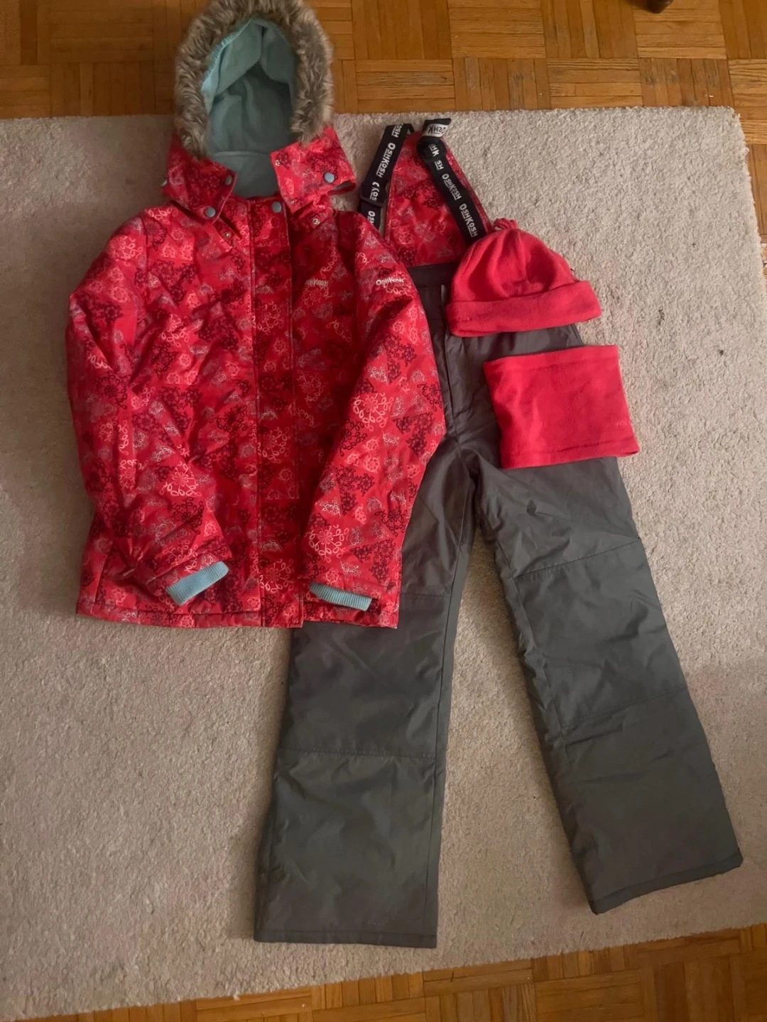 Selling a complete OshKosh B'gosh ski suit! It includes a jacket, pants with suspenders, a hat, and a neck warmer. The jacket is red with a floral pattern, and the pants are grey. Perfect for keeping your little one warm and dry on the slopes!