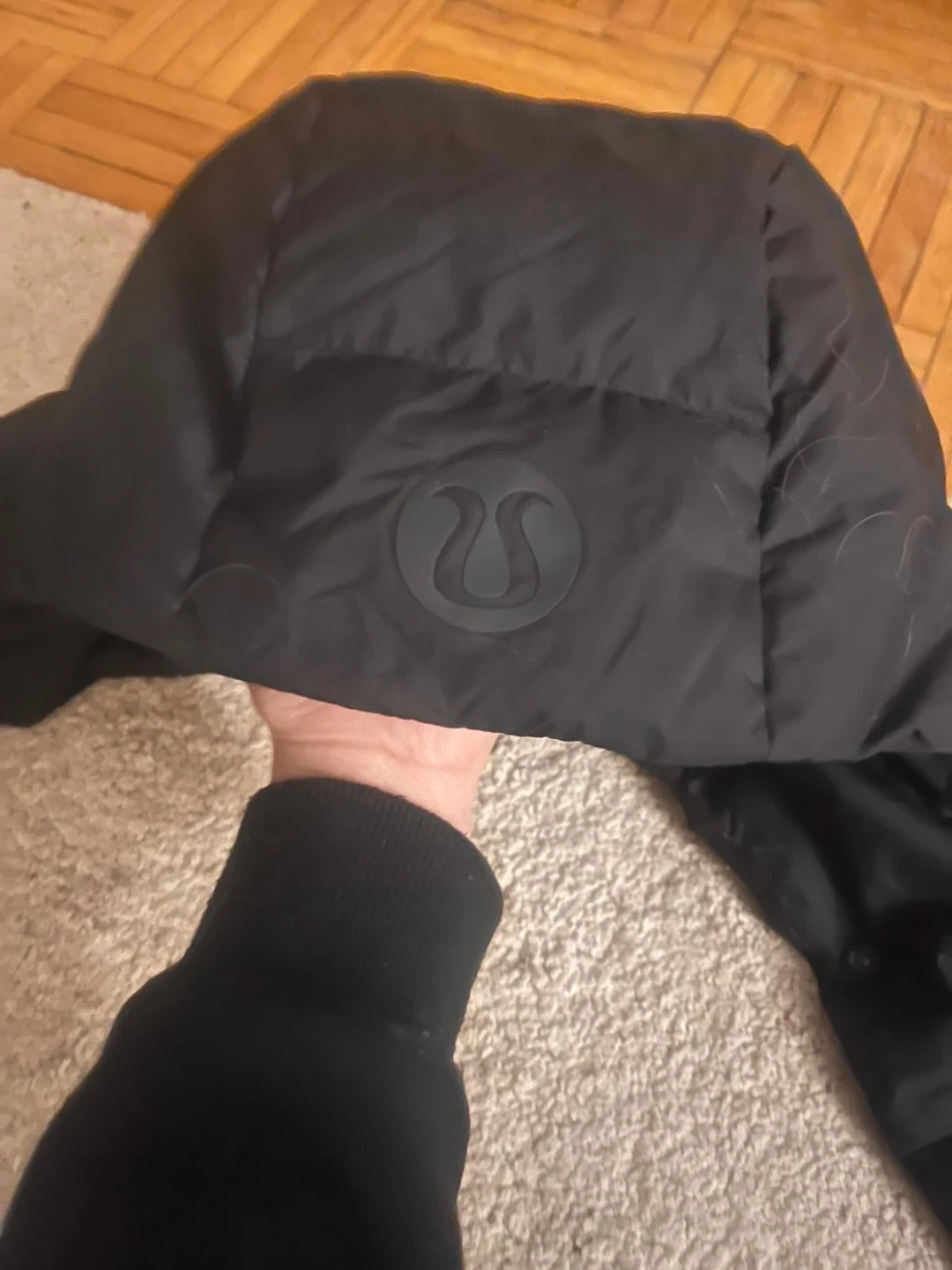Selling a Lululemon black down coat in size 6. The body and lining are 100% polyester, while the cuff is made of 57% nylon, 24% polyester, and 19% Lycra elastane. The pocket lining is also 100% polyester. It's filled with 80% grey goose down and 20% grey goose feathers. The trim filling is 100% polyester as well