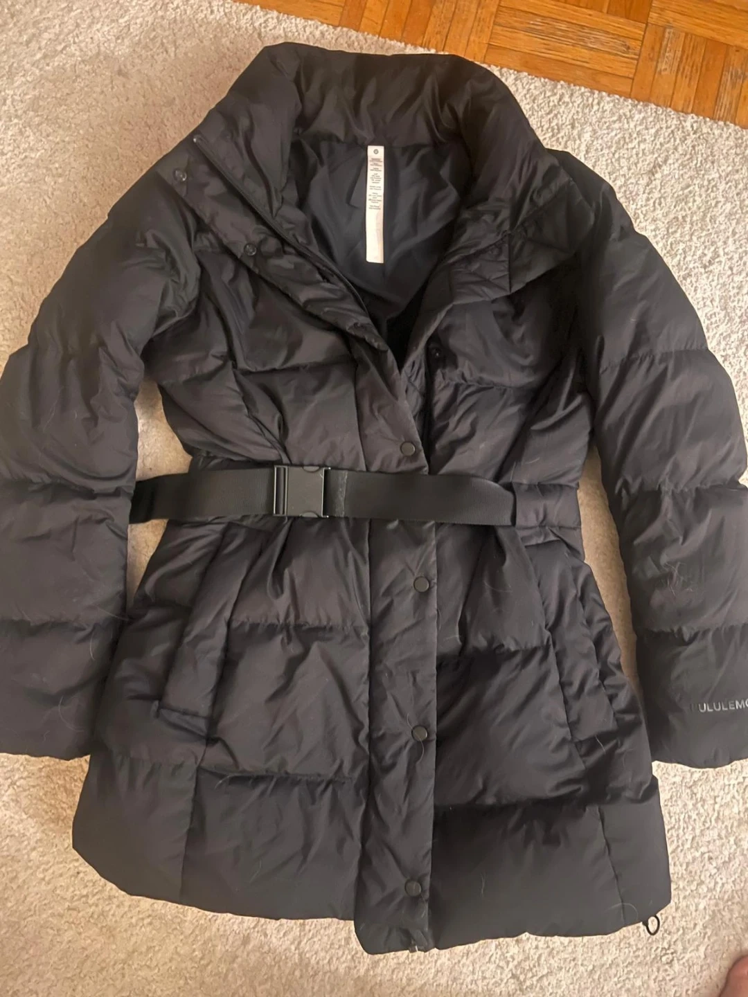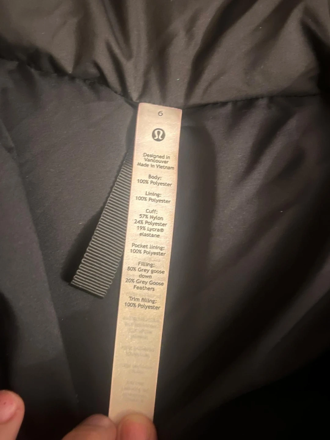 Selling a Lululemon black down coat in size 6. The body and lining are 100% polyester, while the cuff is made of 57% nylon, 24% polyester, and 19% Lycra elastane. The pocket lining is also 100% polyester. It's filled with 80% grey goose down and 20% grey goose feathers. The trim filling is 100% polyester as well