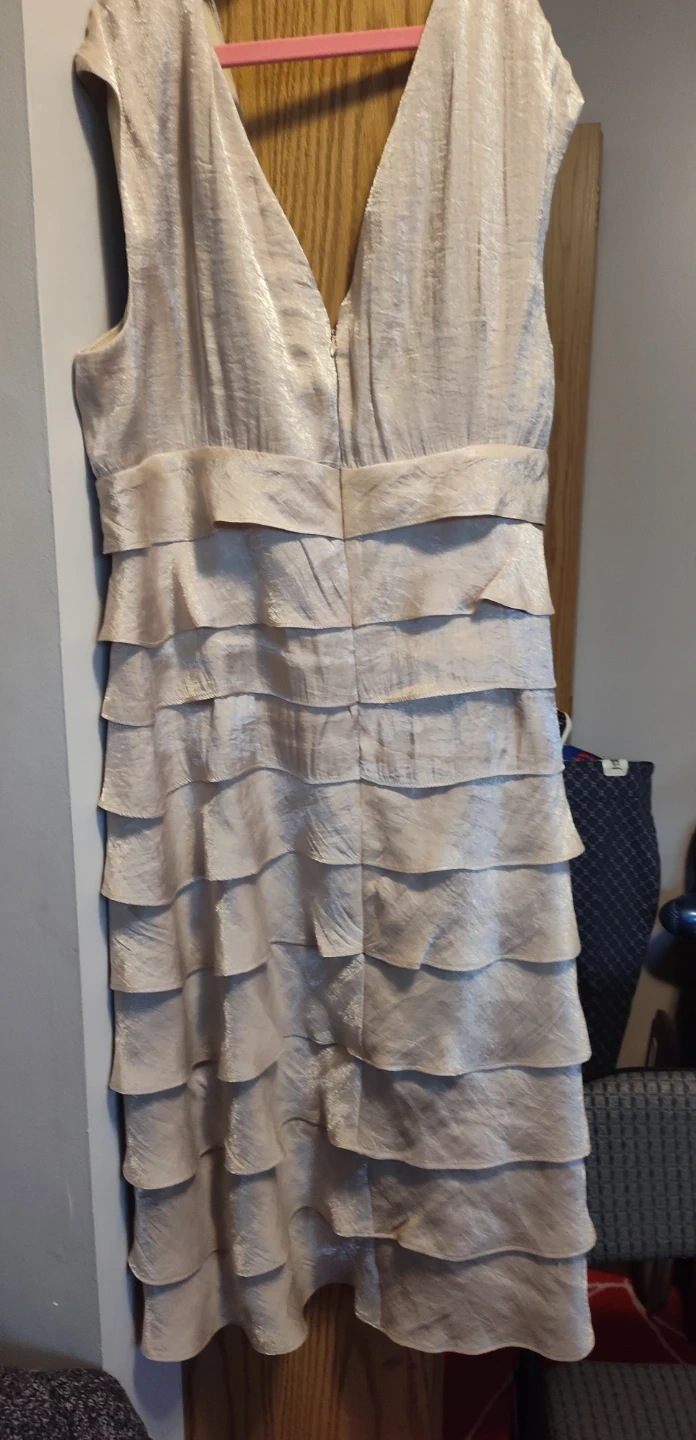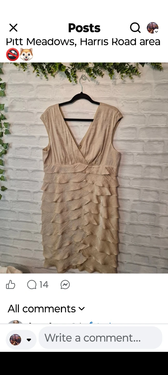 BN just below the knee cocktail dress, zipper in the back, size 18, each ruffle has a lining. The material has a nice shimmer to it(pic does not do it justice). Sadly to small for me so your gain.BN small dog home. PU 216th & Lougheed Hwy or Pitt Meadows.