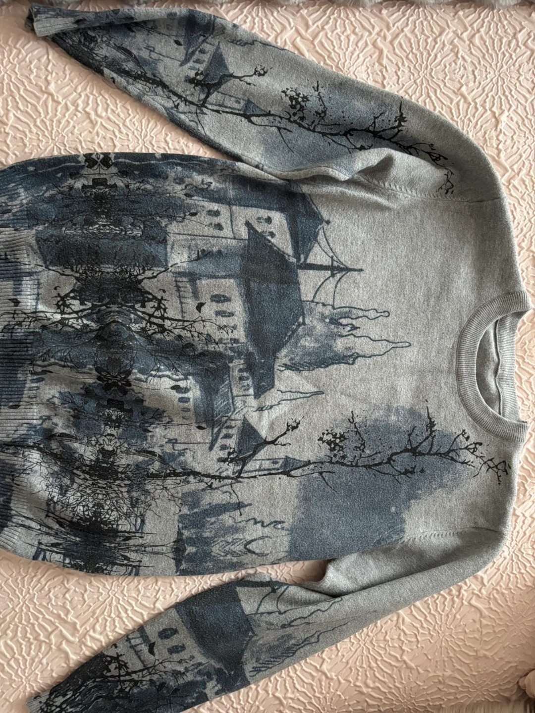 Here's a grey long sleeve sweater with a unique pattern! It's in great condition and ready for a new home.