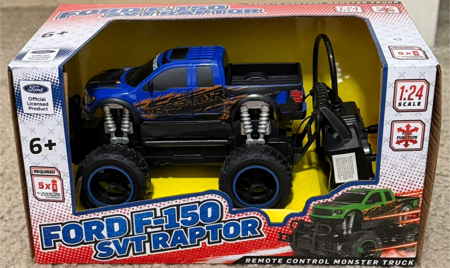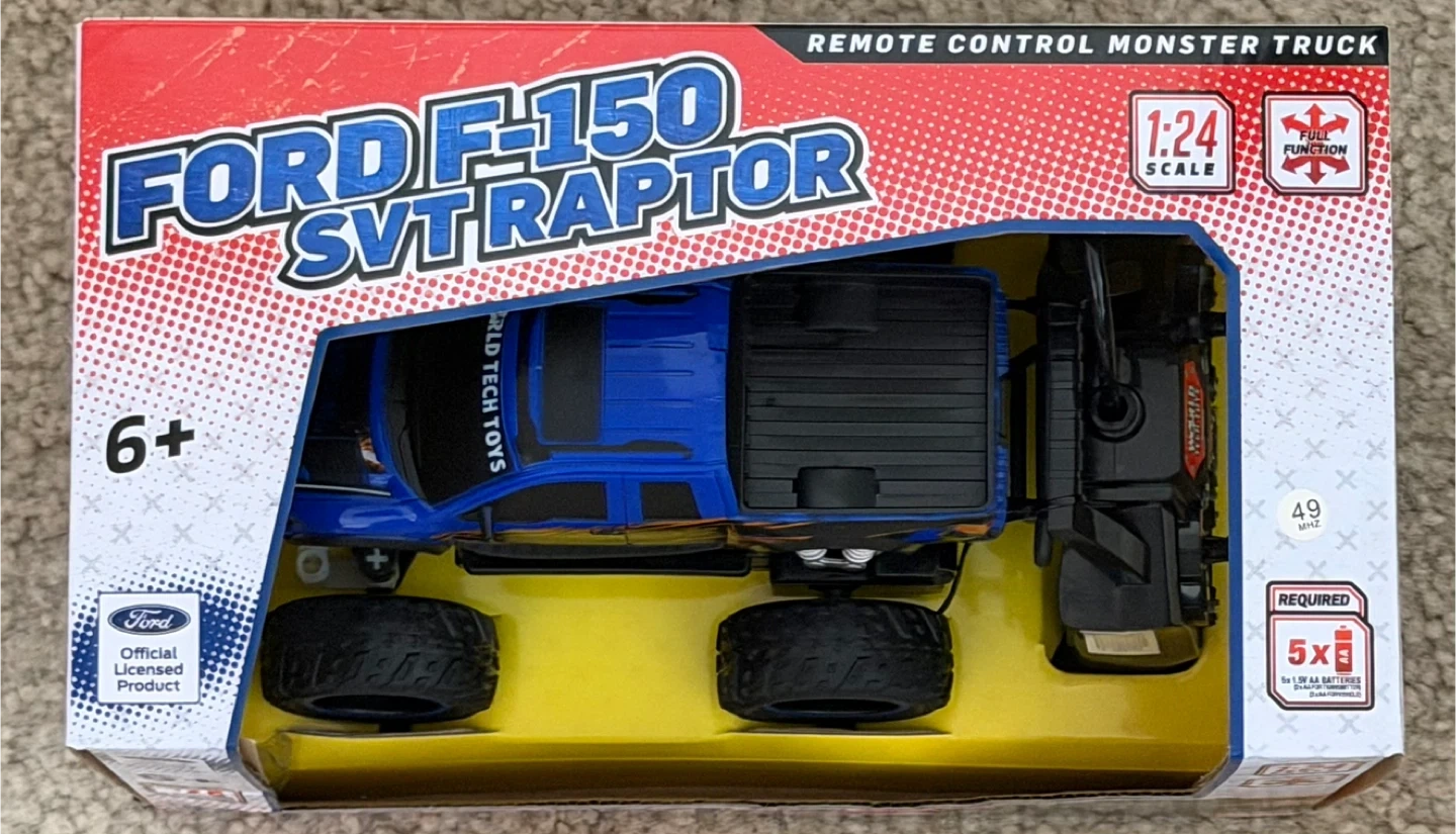 I'm selling a brand new Ford F-150 SVT Raptor remote control monster truck! It's still in its original box and ready for some off-road adventures. This 1:24 scale truck is a Ford Official Licensed Product by World Tech Toys. Requires 5 x 1.5V AA batteries (not included). Suitable for ages 6+