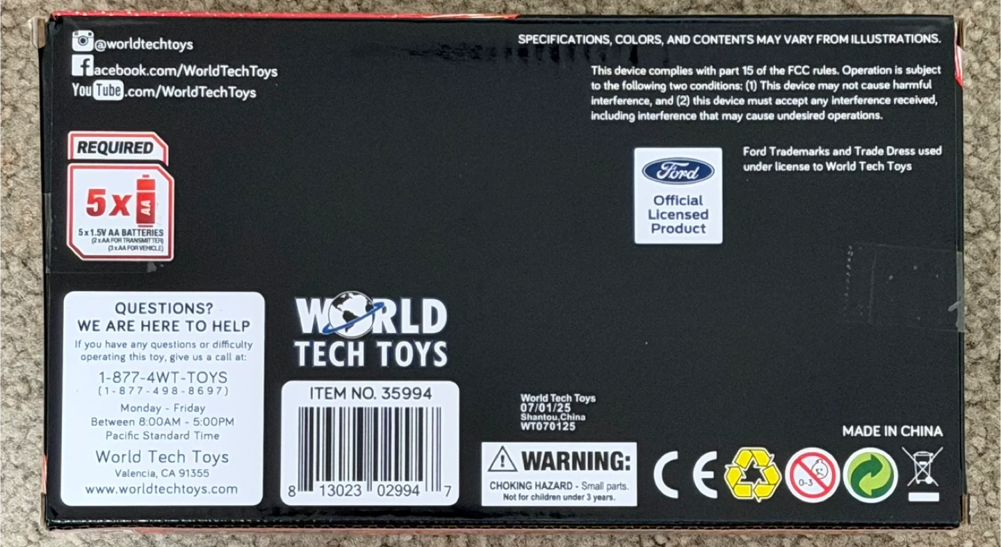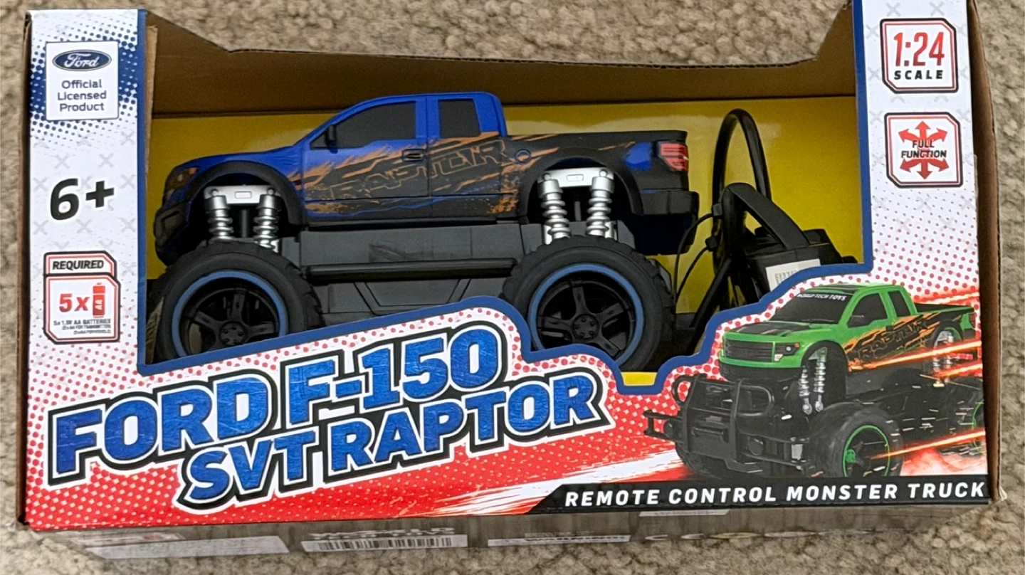I'm selling a brand new Ford F-150 SVT Raptor remote control monster truck! It's still in its original box and ready for some off-road adventures. This 1:24 scale truck is a Ford Official Licensed Product by World Tech Toys. Requires 5 x 1.5V AA batteries (not included). Suitable for ages 6+