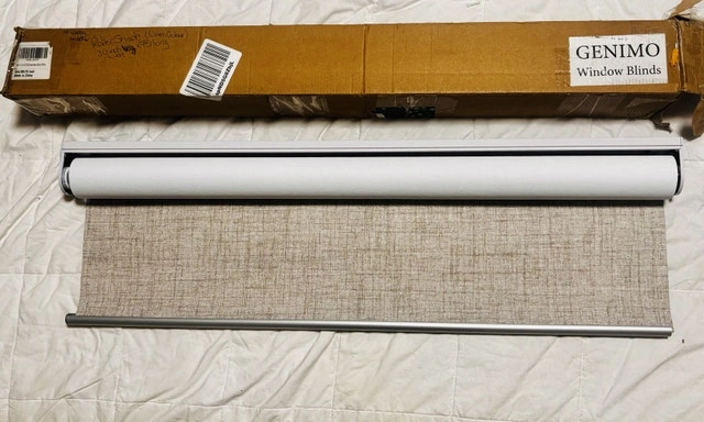 I am selling a Genimo roller shade, brand new and still in its original packaging. Please note, that the mounting bracket is missing. The shade is linen in colour and measures 30 inches wide by 75 inches long, making it an ideal fit for various window sizes.