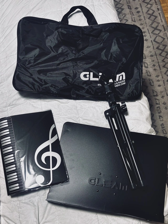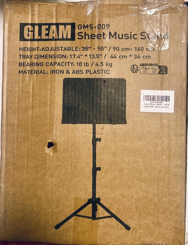 I am selling a brand new Gleam sheet music stand still in its original box, perfect for musicians of all levels. The stand is adjustable, ranging from 35 to 55 inches (90-140 cm), and features a tray dimension of 17.4 x 13.5 inches (44 x 34 cm). Constructed from iron and ABS plastic, it has a bearing capacity of 10 lbs (4.5 kg). This music stand also includes a sheet music binder and a carrying bag for easy transport and storage. If the ad is up, it's still available!