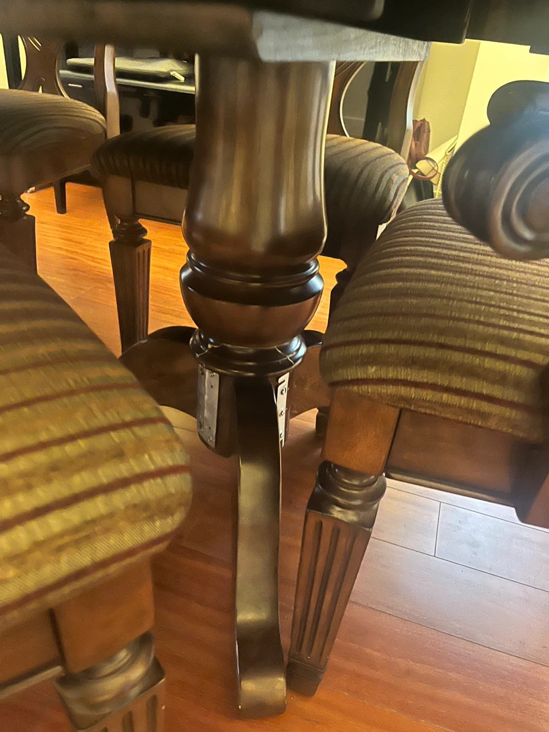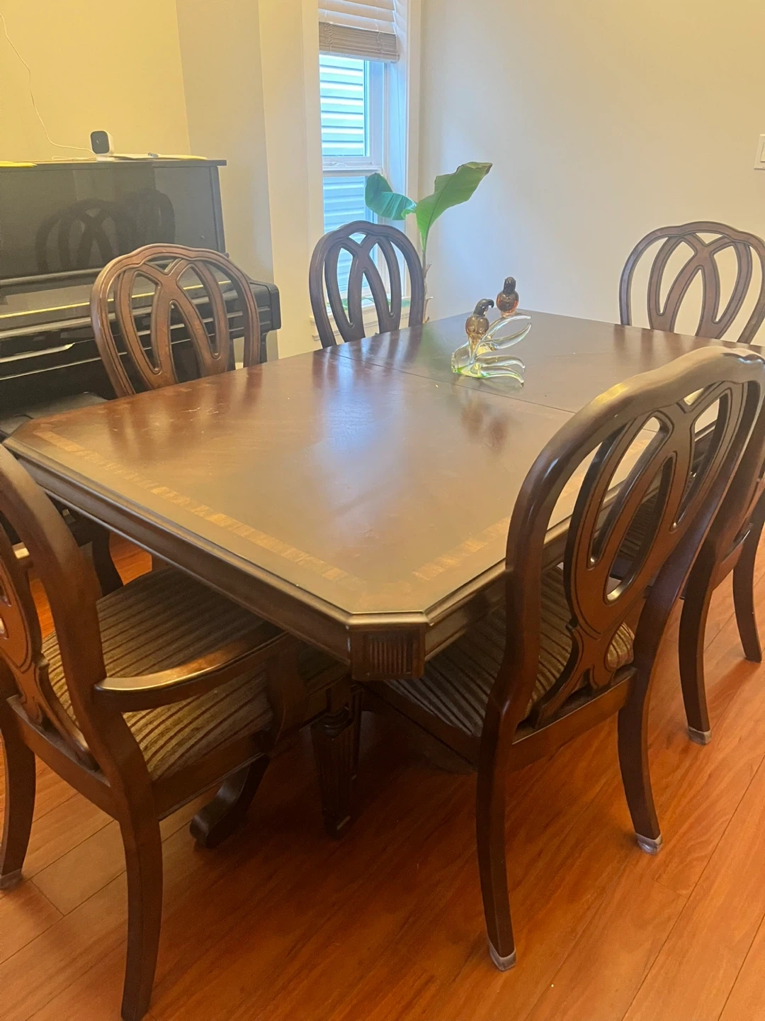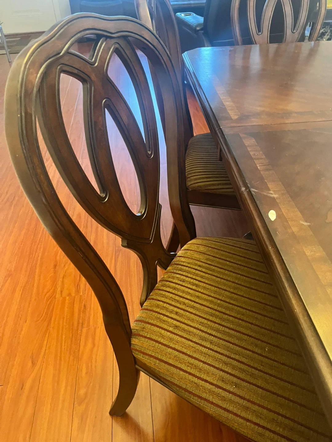 Selling a dining table with six chairs. It is a wooden table with a dark brown finish. The chairs have striped cushions. One leg fixed as it was cracked in between.