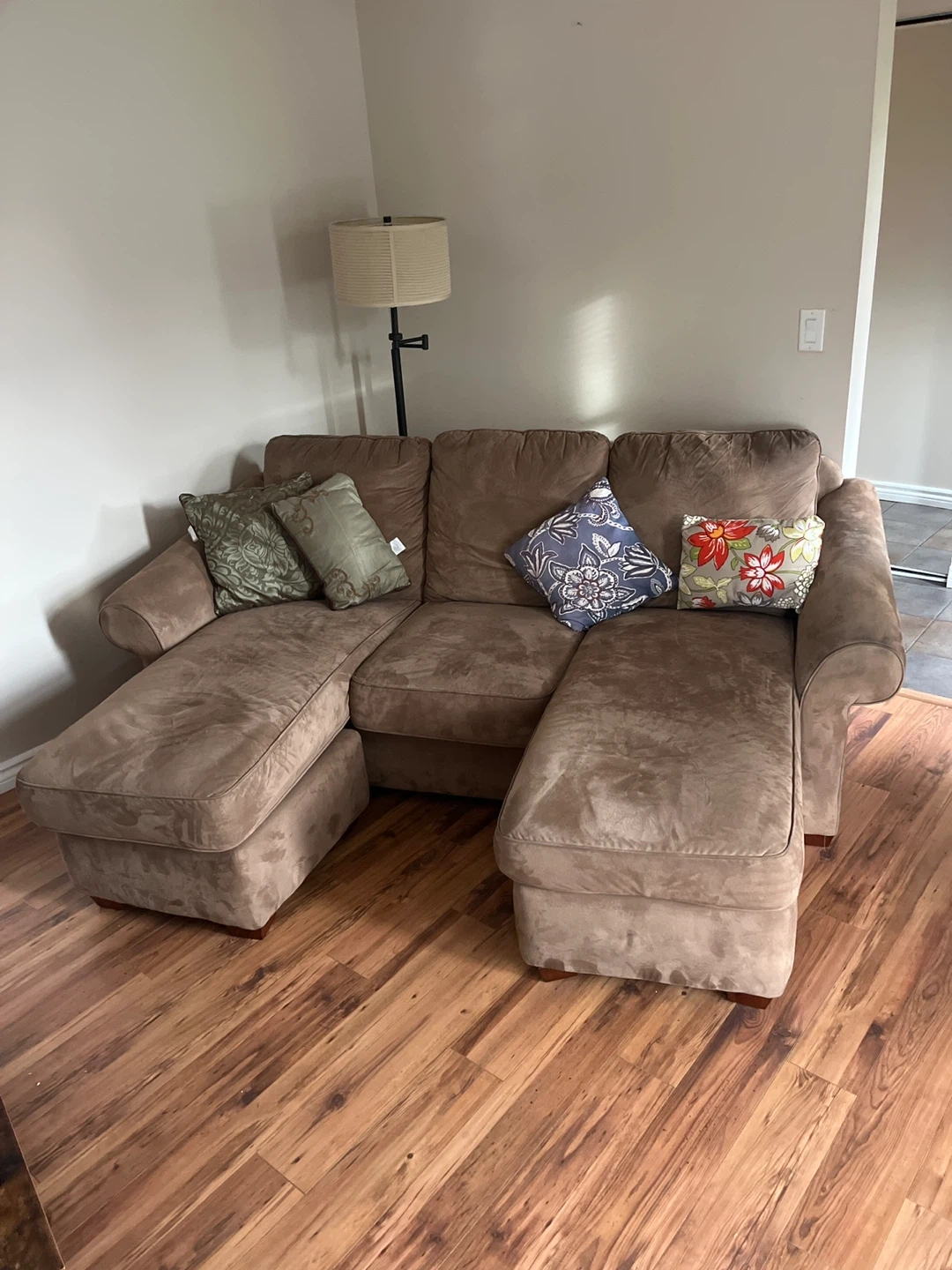 Selling a comfy brown sectional sofa. It's in good condition and has a chaise lounge on both ends for extra relaxation. Perfect for a living room or den