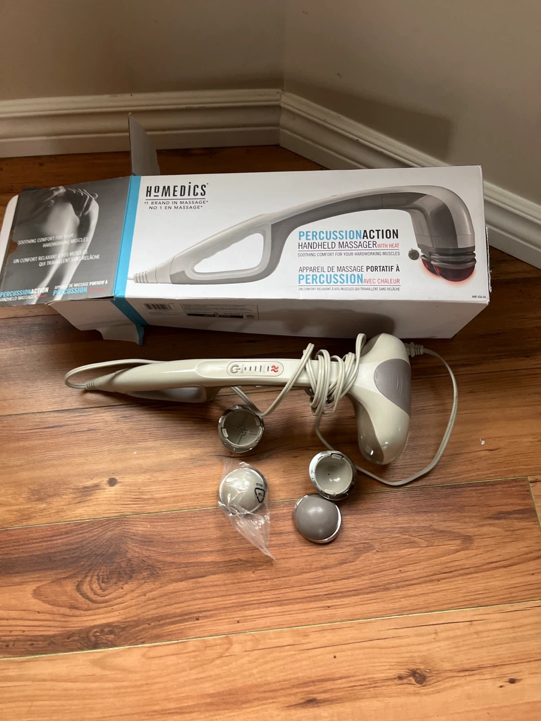 I'm selling a HoMedics Percussion Action handheld massager with heat. It's designed to provide soothing comfort for your hardworking muscles. The box is included, along with the different attachments!