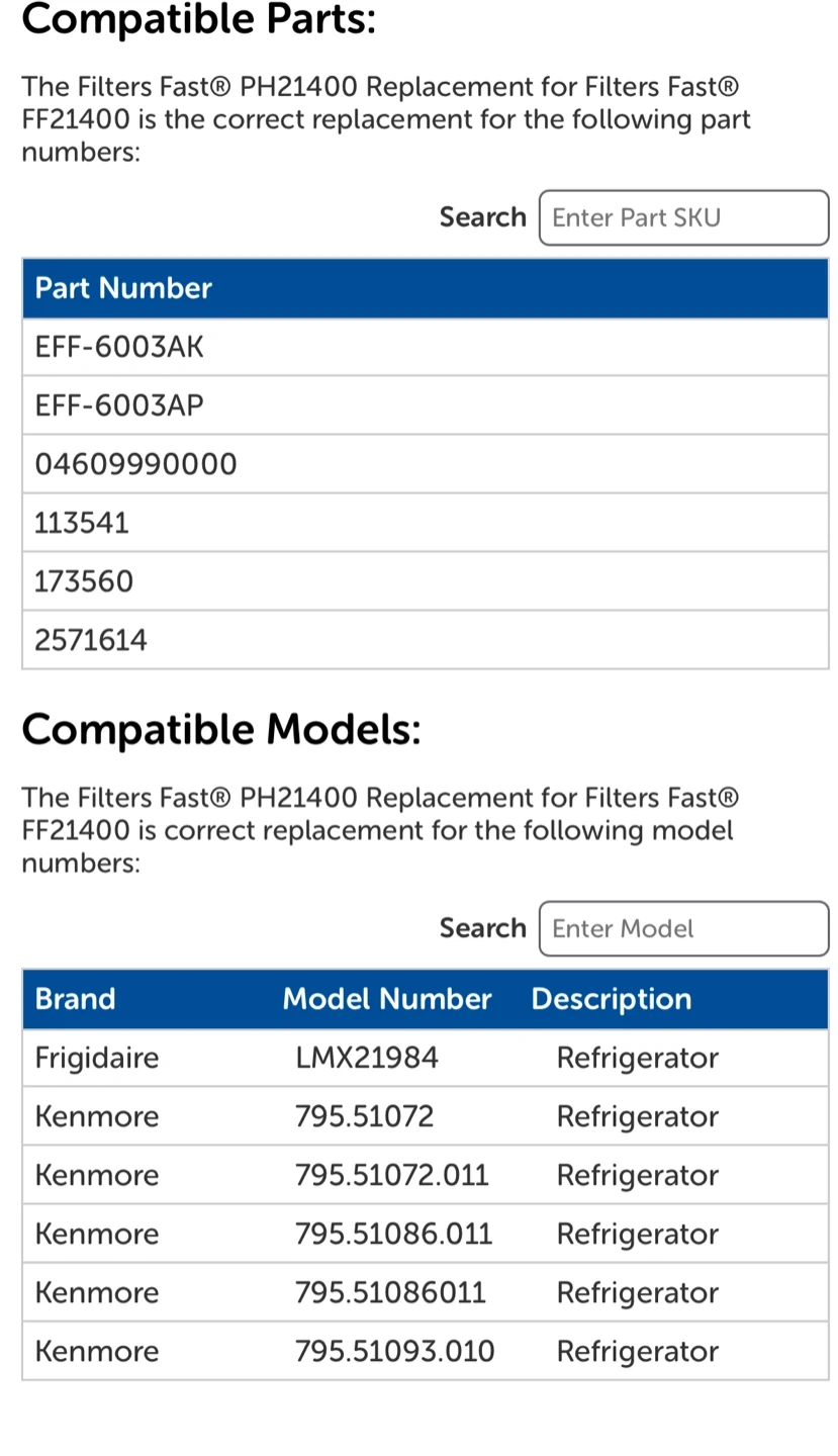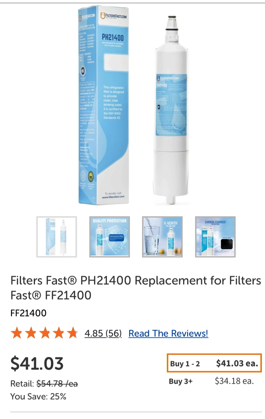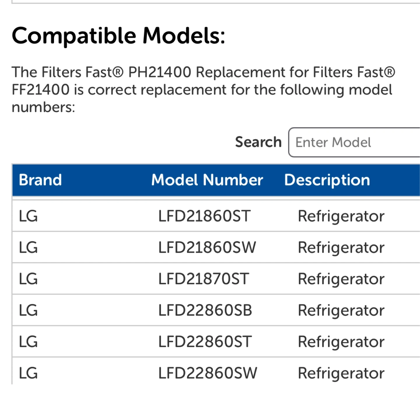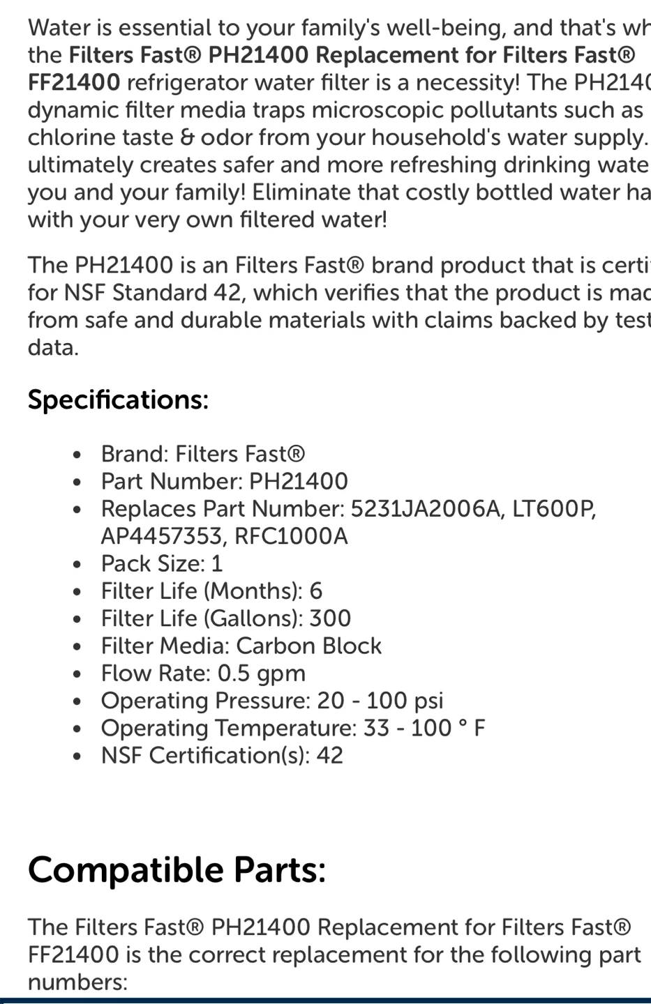 Selling 2 Filters Fast PH21400 refrigerator water filter. This filter is designed to provide clean drinking water. It is certified to NSF/ANSI standards 42, 53, and 401. It replaces part number 5231JA2006A, LT600P, AP4457353, RFC1000A. It has a filter life of 6 months or 300 gallons.