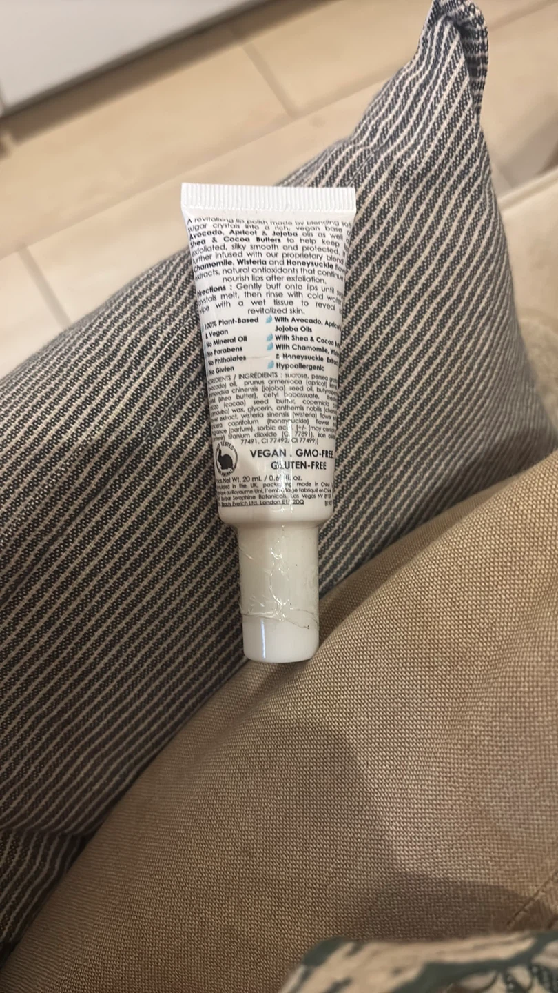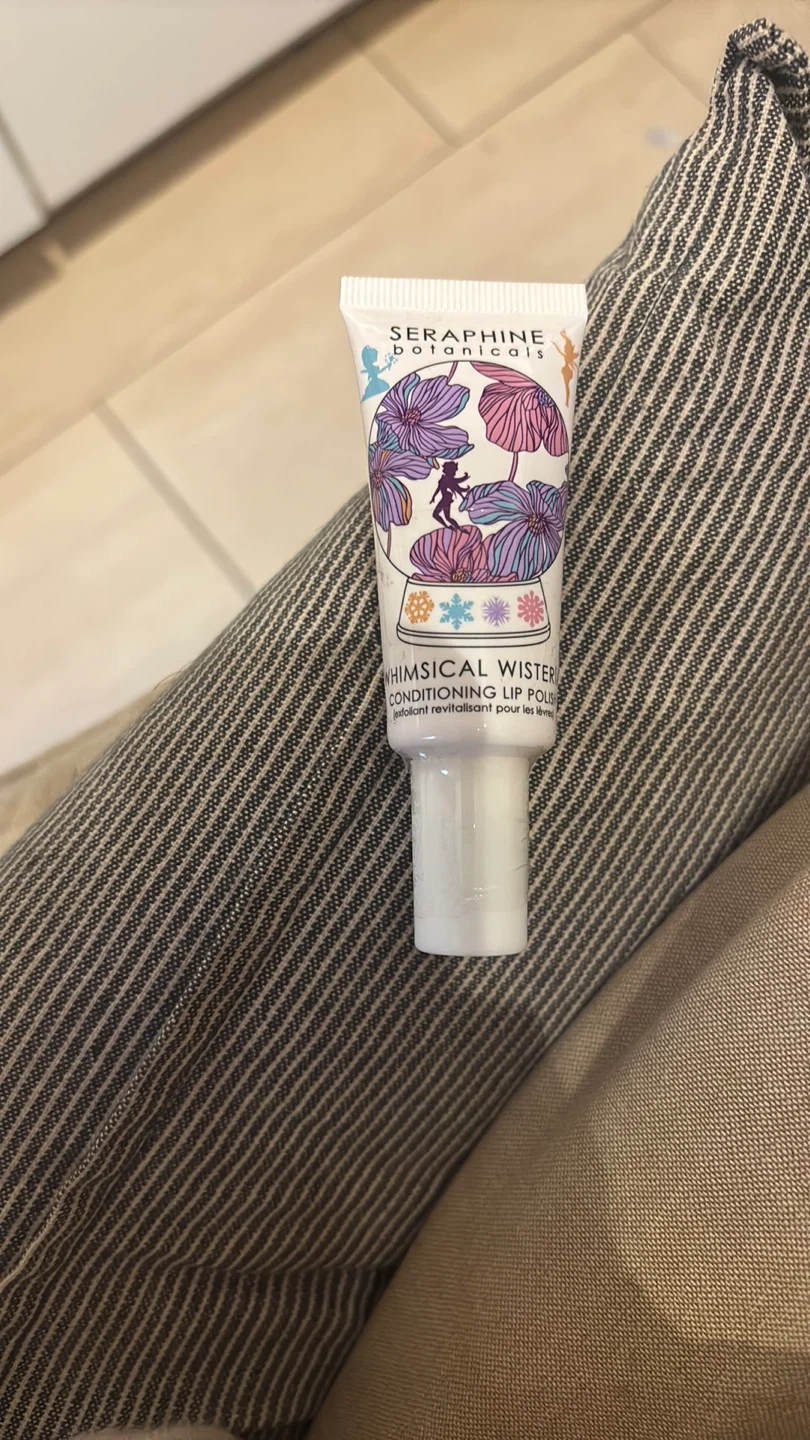 I'm selling a Seraphine Botanicals Whimsical Wisteria Conditioning Lip Polish. It's a revitalizing lip scrub made by blending 100% plant-based ingredients like Avocado, Apricot, and Jojoba oils, as well as Shea and Cocoa Butters. It gently exfoliates and nourishes lips after exfoliation. It's also vegan and gluten-free