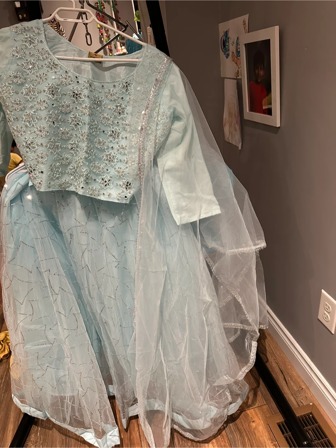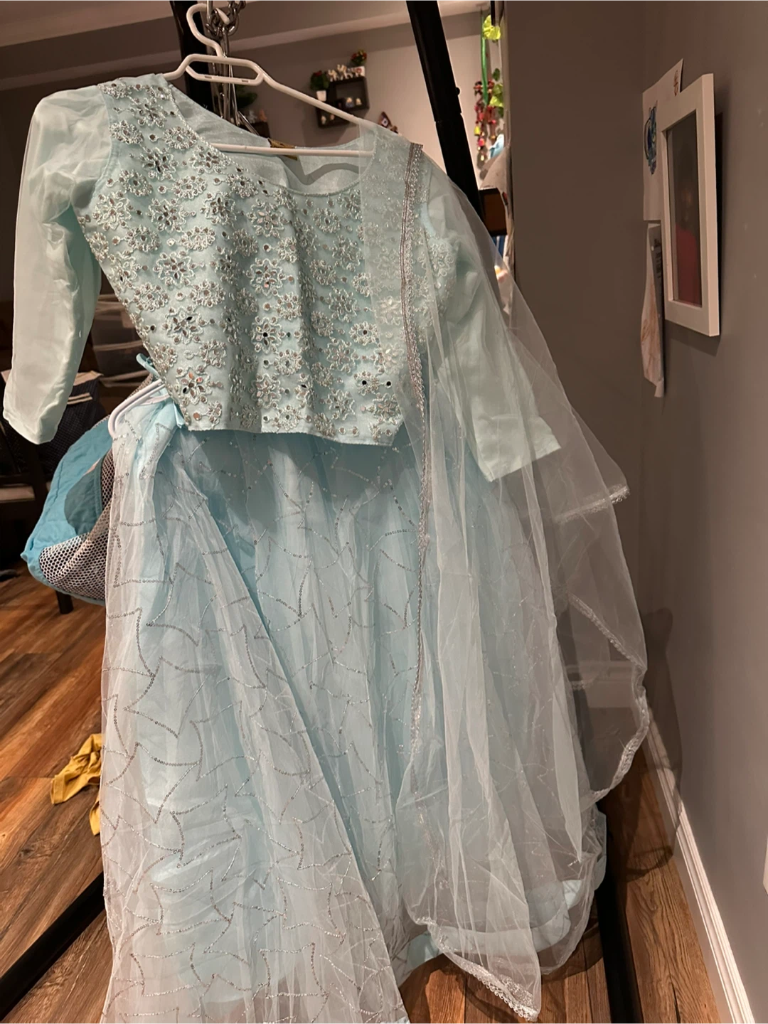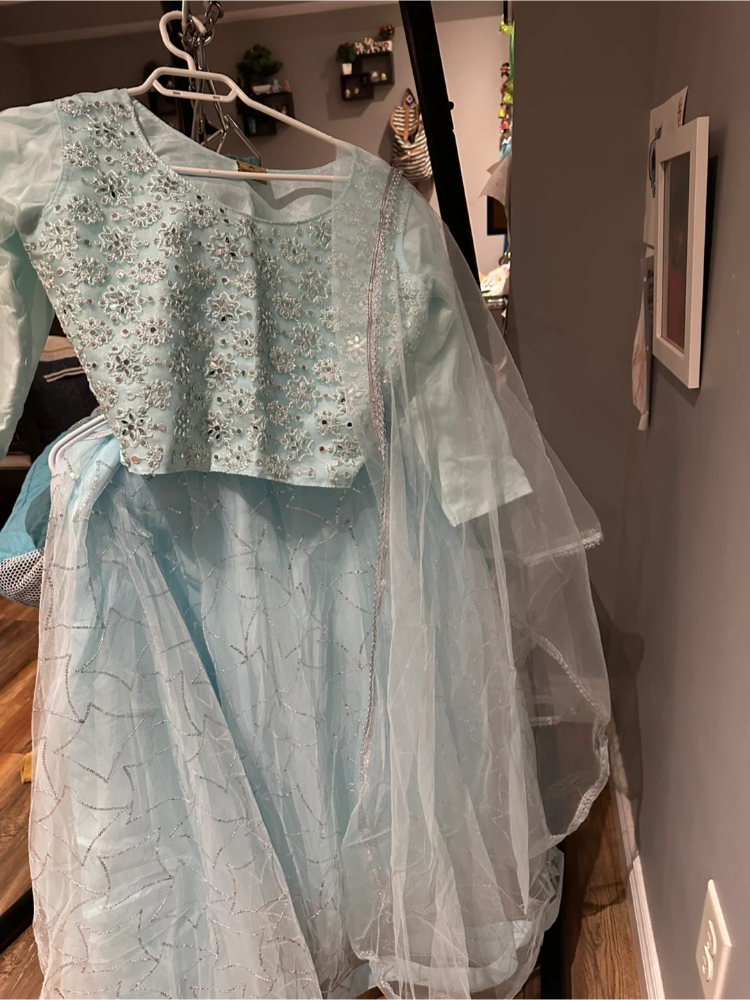 Selling a beautiful light blue lehenga choli set. The set features intricate embellishments and a flowing skirt. Perfect for a special occasion!
