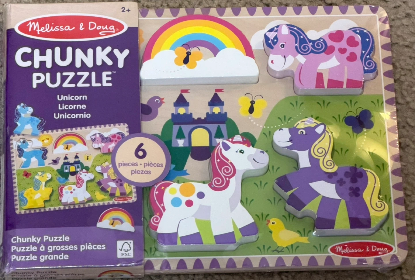 This Melissa & Doug Unicorn Chunky Puzzle is brand new and ready for a new home! It's a wooden puzzle with 6 pieces, perfect for little hands. The pieces stand up for pretend play, adding an extra layer of fun for your child. Recommended for ages 2+