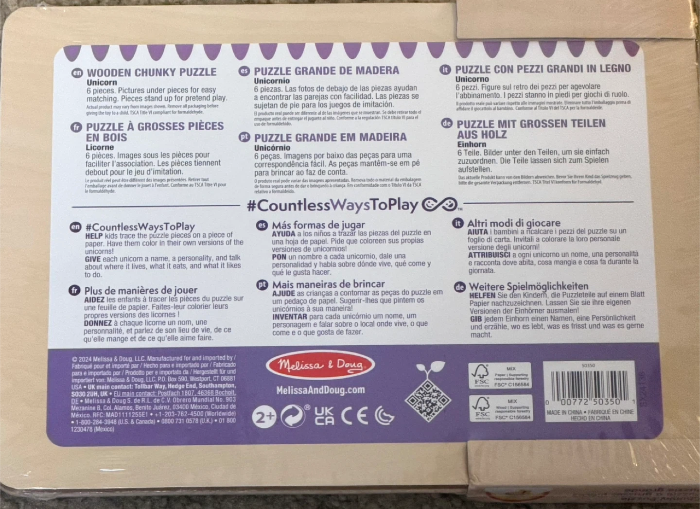 This Melissa & Doug Unicorn Chunky Puzzle is brand new and ready for a new home! It's a wooden puzzle with 6 pieces, perfect for little hands. The pieces stand up for pretend play, adding an extra layer of fun for your child. Recommended for ages 2+