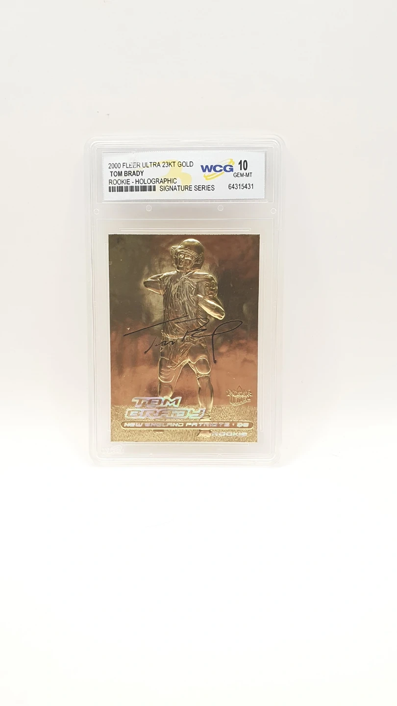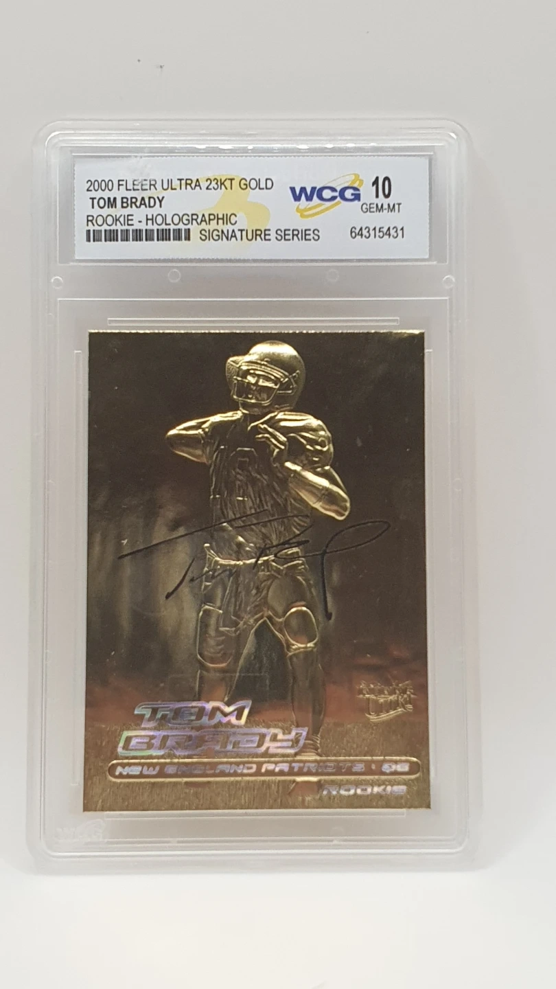 Selling a 2000 Fleer Ultra 23KT Gold Tom Brady Rookie - Holographic Signature Series card. It's graded WCG 10 GEM-MT. A great addition to any collection!