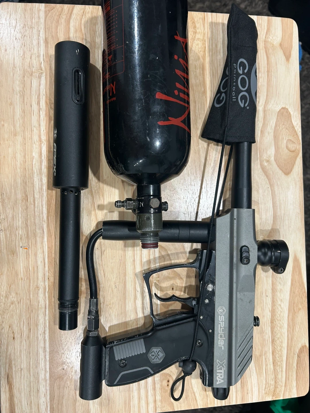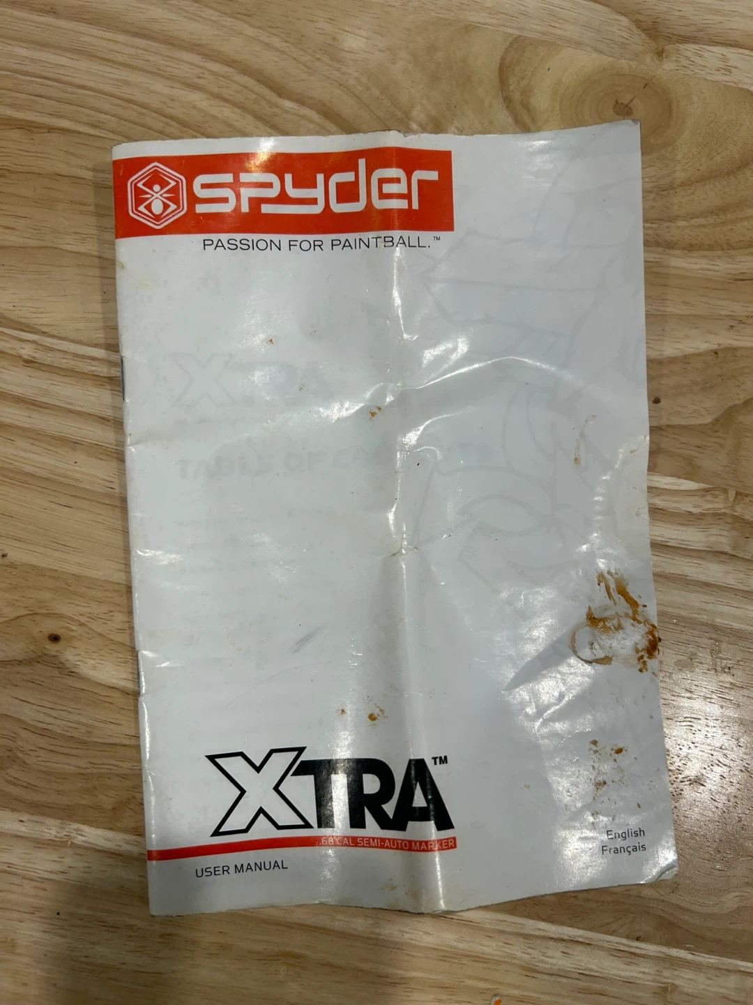Selling a Spyder Xtra paintball marker. It comes with the user manual and other components ( air tank, second barrel) as pictured. Great for getting into paintball!