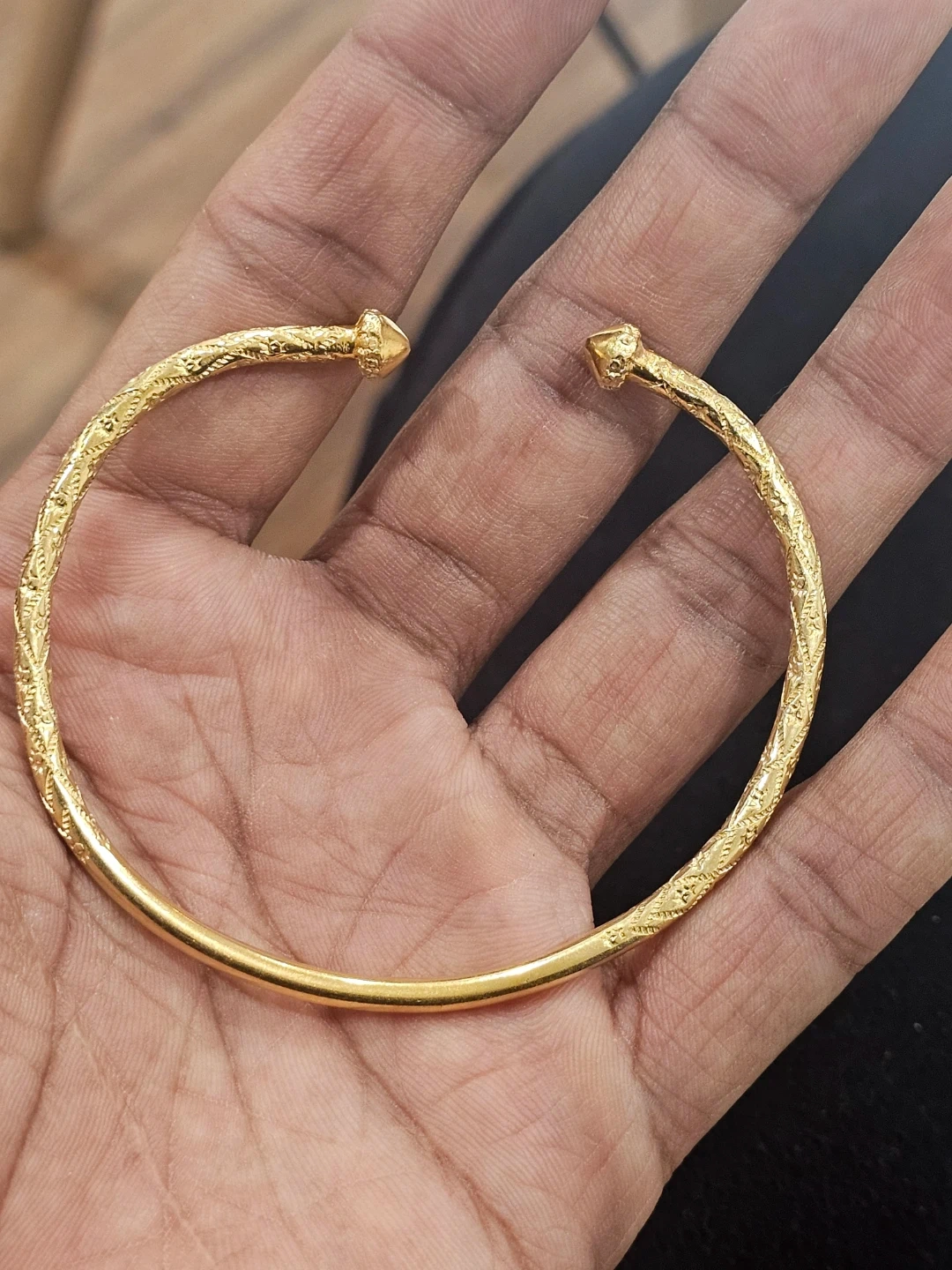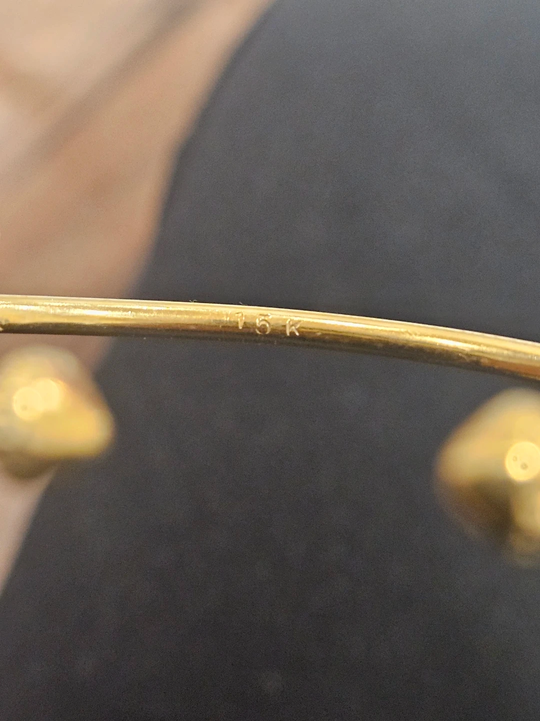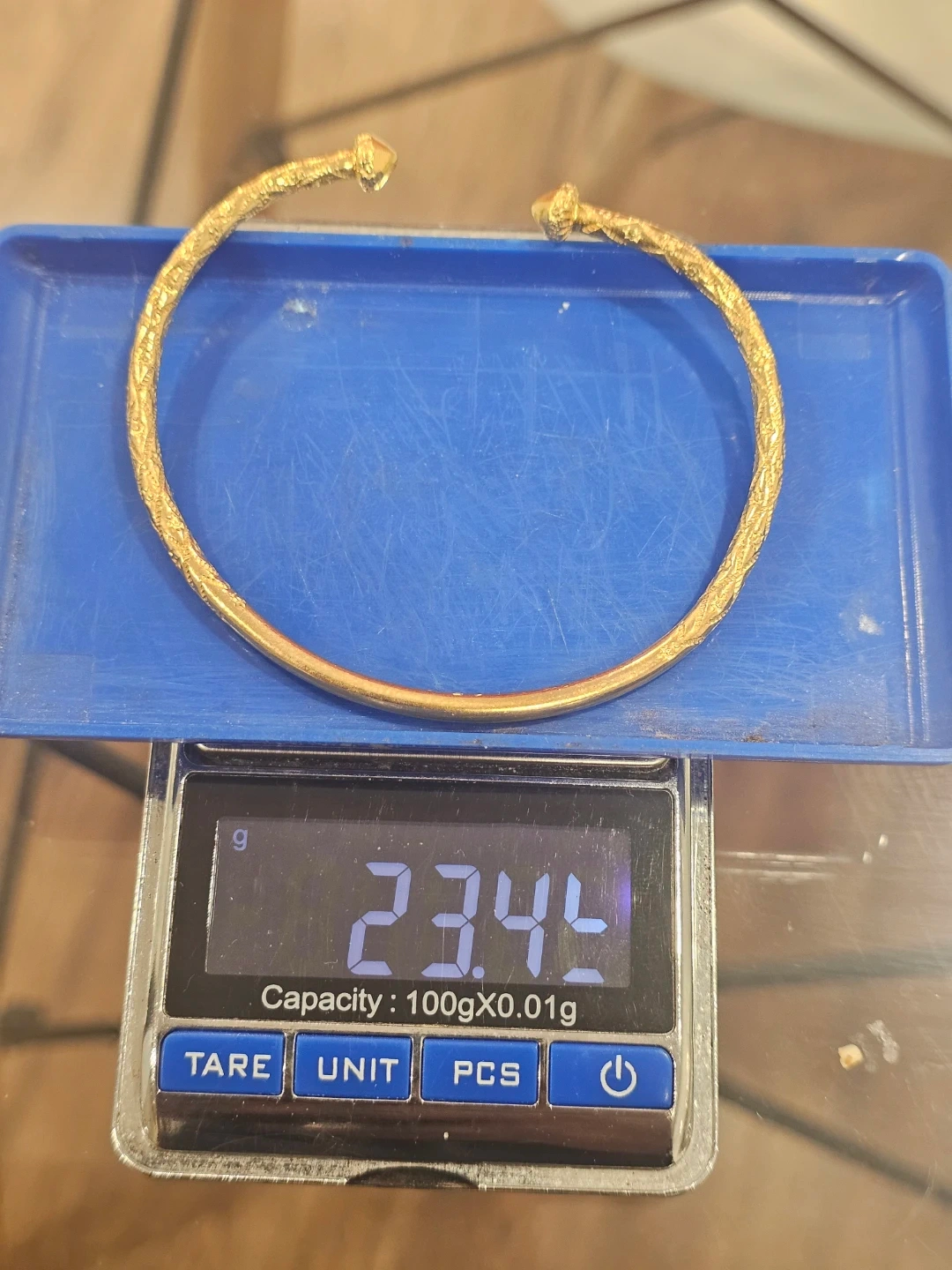 Selling a beautiful 15K gold bangle bracelet. It weighs 23.44 grams and has a unique design. It's in great condition and ready to wear!