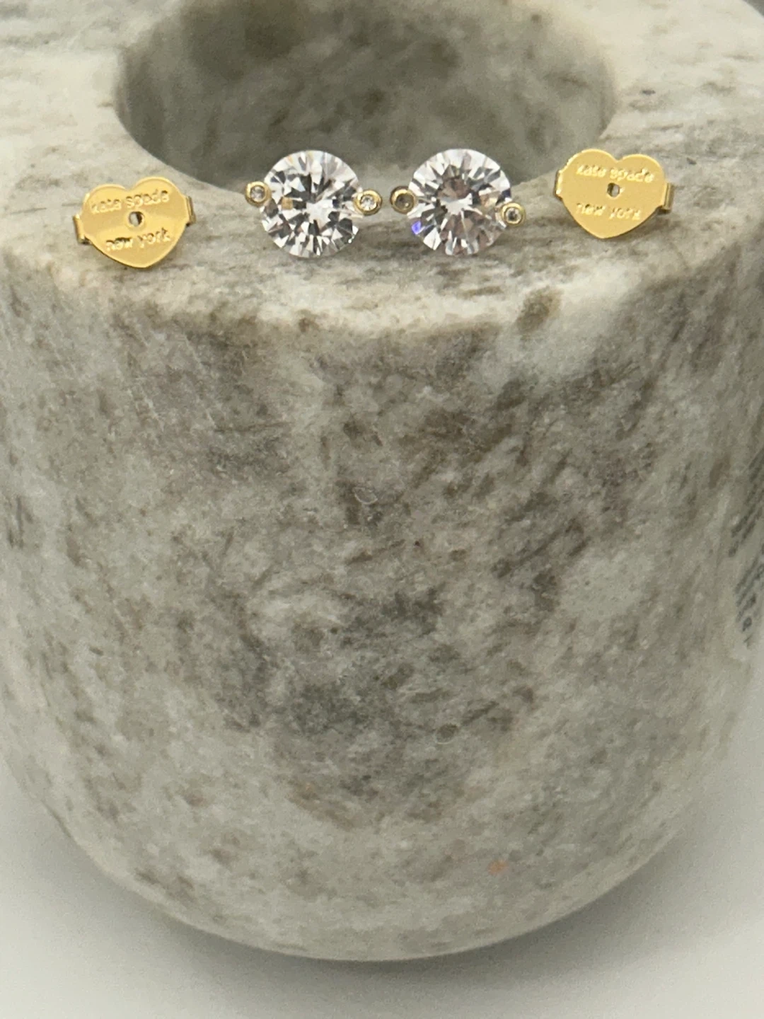 Selling a pair of Kate Spade New York stud earrings. They are gold with princess cut diamond like stones. The backs of the earrings are heart shaped and engraved with the Kate Spade logo. They are new ordered extra pair .so selling the new ones