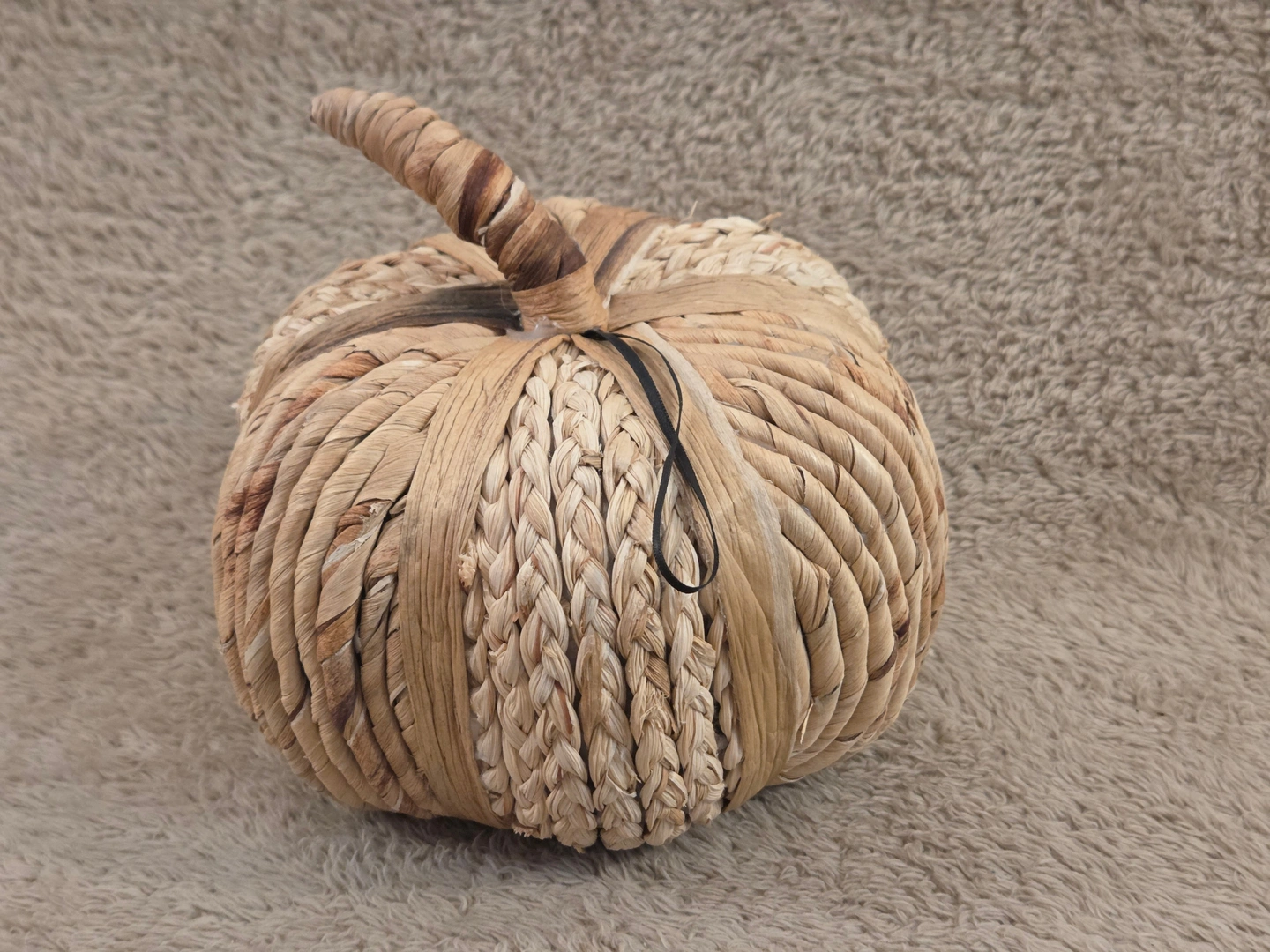– Key specs: decorative pumpkin made of braided natural fibers (straw/seagrass style), lightweight, neutral beige tones, rustic/boho look, small size for shelf or table display